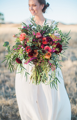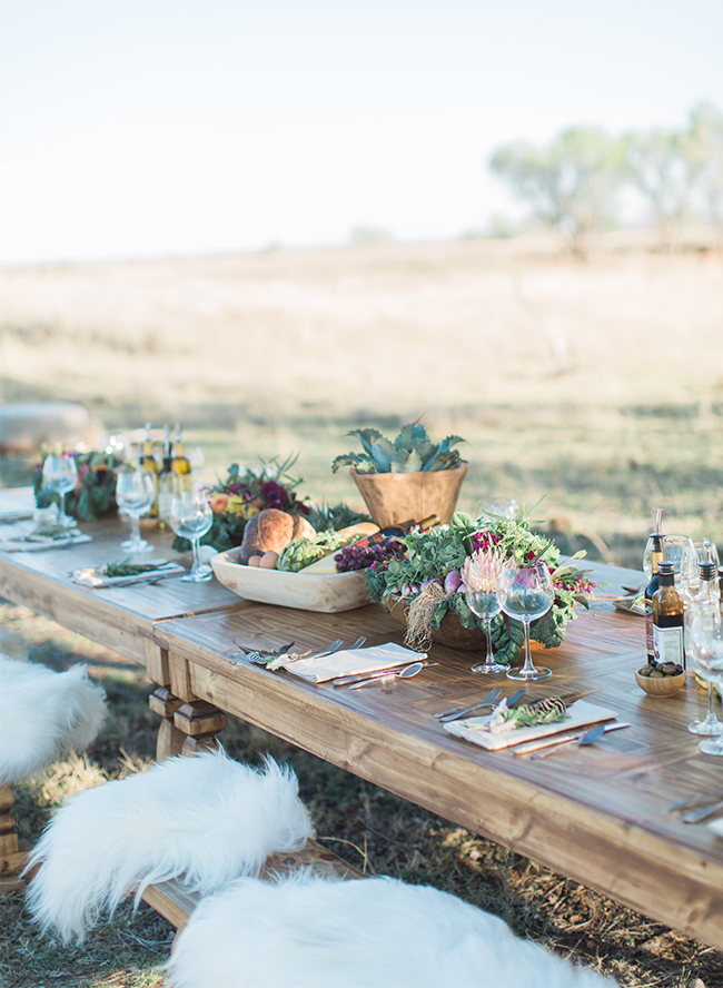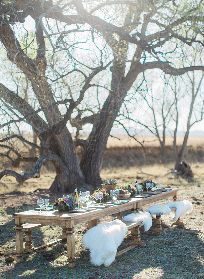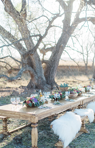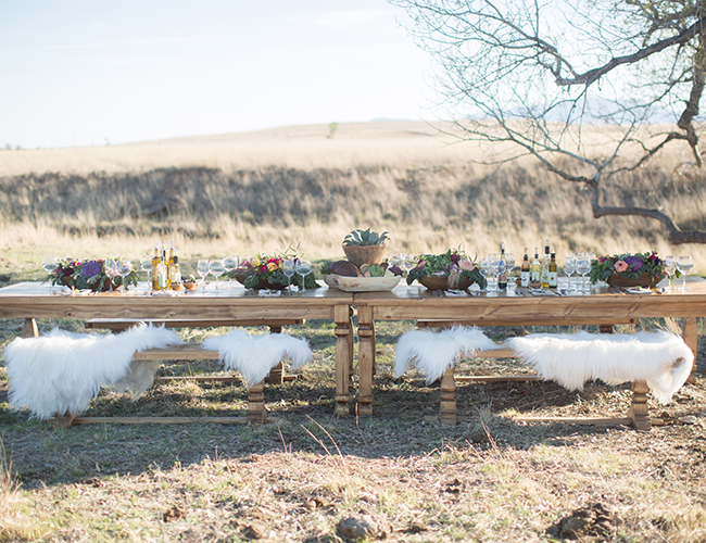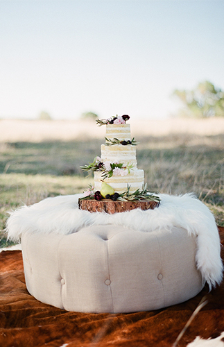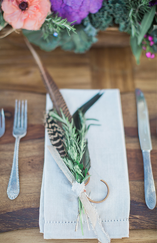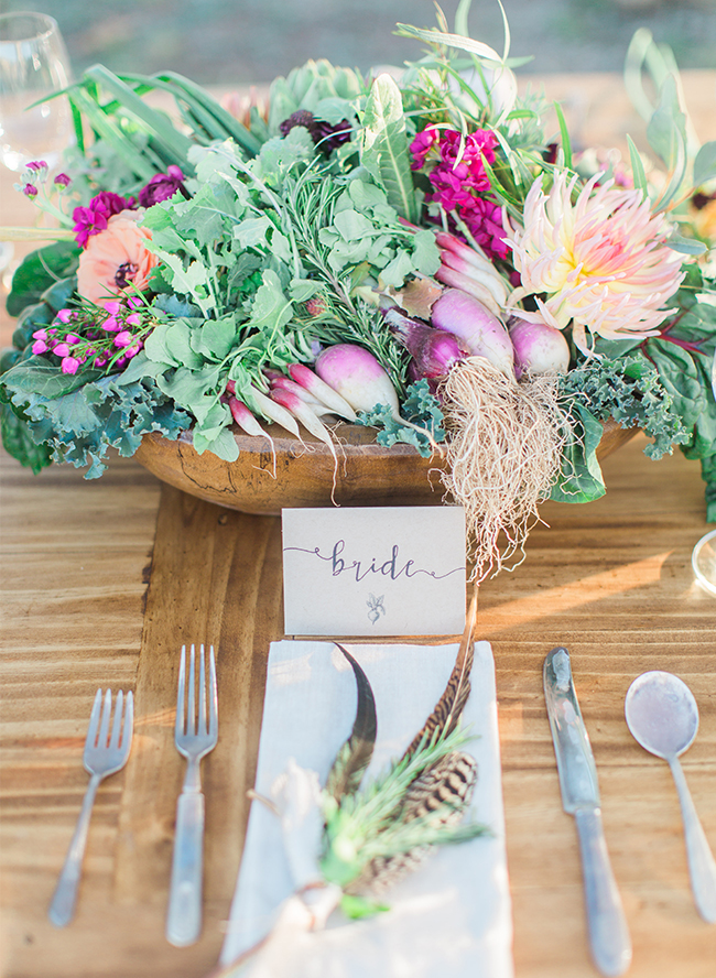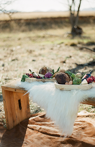 LaFleur drew their inspiration from the beauty of the grassland plains of Arizona’s southwest region. Desert hues of Arizona sunsets created the color palette using peach rununcululs, burgundy dahlias, chocolate scabiosa, pink boronia and sage willow eucalyptus. Seasonal produce provided by local CSA Sleeping Frog Farms accented the floral perfectly with coordinating luscious colors of radish, carrots, cauliflower, artichokes, and winter greens. It was important to honor the integrity of the local purveyors and artisans by choosing decor that was sourced locally and provided a rich patina to their surroundings. The cake for instance was an Italian Lemon Buttermilk Cake layered with Mesquite Honey Basil from local baker Sugar Song Cakes. LaFleur chose beautiful pieces of natural wood, tarnished silver, cowhides, sheepskins, rooster feathers and raw leather.