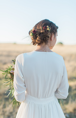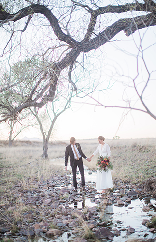Soon after my meeting with Colleen at LaFleur, Alexis from Avenue Boutique and Vanessa from Studio 110, jumped onboard and started coming up with concepts to make the shoot truly unforgettable. Alexis designed and made the bride’s dress, which she also sells in her shop here in Tucson. She also made the bridesmaids’ dresses, along with all the gorgeous jewelry in the shoot. Naturally, she had her hand in styling the groom and even the guests. Vanessa and her crew at Studio 110 came up with the hair and make-up concepts, making the bride and bridesmaids all look natural and beautiful. She also cleaned up the groom, preserving his natural and effortless look. Next came the amazing team of local entrepreneurs/food artisans who gave our local ranch/produce inspired shoot just what it needed. Donations spanned several amazing vendors, including Sleeping Frog Farm (local, organic produce), Whisky DelBac (handcrafted Tucson whiskey), Borderlands Brewery (local handcrafted beers), and Time Market (handmade, stone oven breads and local wines).