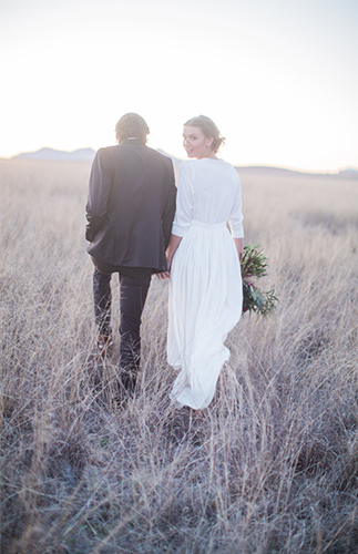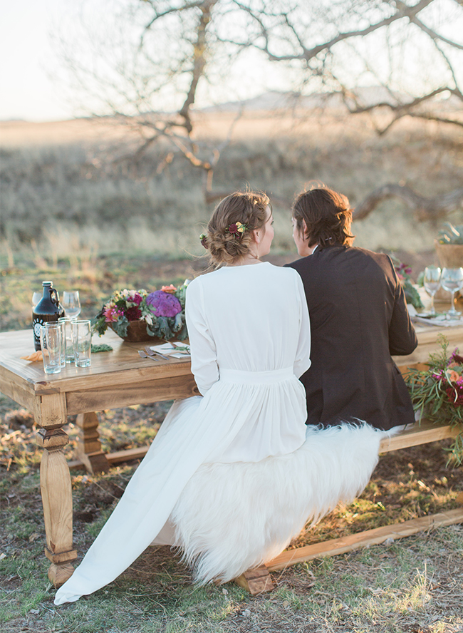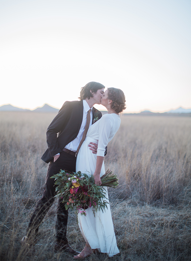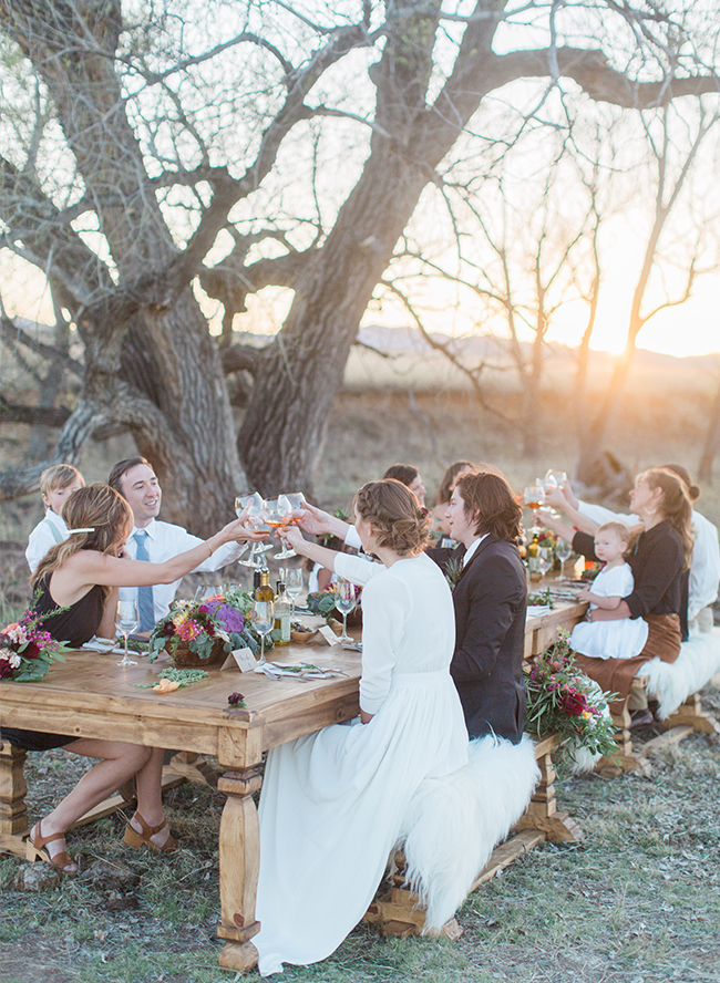 This farm to table wedding on our wedding blog today is as fresh and beautiful as can be. With a Arizona sunset as the backdrop and vendors that put their heart and soul into making it the most incredible affair. The bride, in a handmade, long sleeved gown, matched the natural and ethereal setting. The family and friends dined on a long wooden table adorned with the most radiant colored produce and florals. Elizabeth McDonnell photographed the wedding and gave us all the details of the inspiration here.