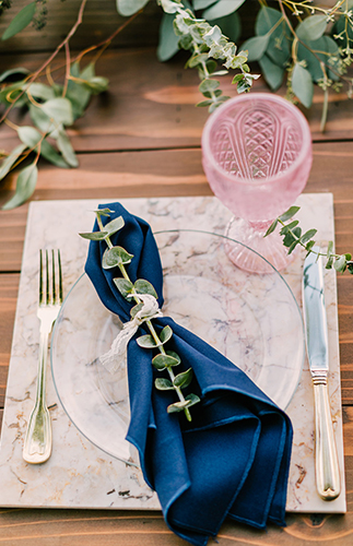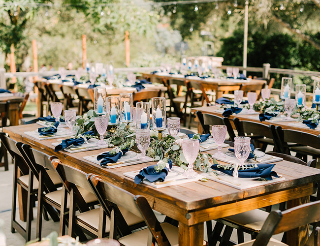 Cherry blossom marble chargers created the perfect resting spot for glass china. Each place setting adorned with gold flatware and vintage pink water goblets kept their color scheme coordinating through all of the different design elements. an outdoor rustic bistro was built on their tennis court with market lights hung high. The father of the bride built both the royal tables and sweetheart table. Each table was adorned with custom gold, gas pipe candelabras decorated with blue dip dyed wax candles.
