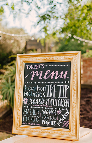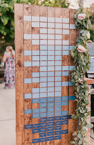 Emilie and Corey were married at their home in Fallbrook, California in front of 130 of their closest friends and family. After months of searching for the perfect venue, they realized that the perfect place for the two of them to start their lives as Mr. andMmrs. would be none other than their beautiful ranch property. With an already built custom backyard barn, it created the perfect place for the two of them to exchange their vows. the bride built a gorgeous chevron patterned wooden wall and abby of surgar rose came through with the european style rustic florals. Guests were escorted to their tables with a glass of champagne and a pantone colored paint swatch, each individually gold calligraphied by the bride.