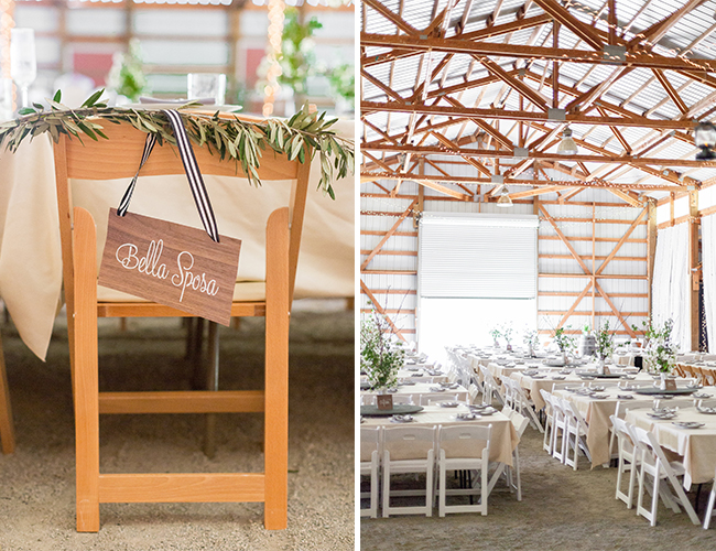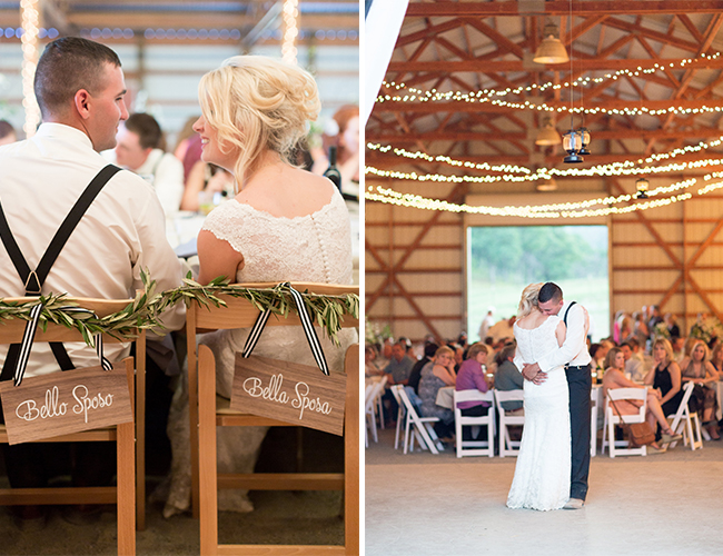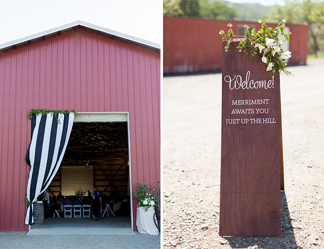 It’s hard to find a detail in our wedding that didn’t have some sort of significance. I knew from the very beginning of the planning process that we would incorporate dogwood absolutely everywhere in honor of my groom’s mother who passed away just five short months before we were married. Our wooden invitation, hand-created on an antique foil press by yours truly, is my most favorite detail. Our leather keychain favors (only appropriate for a cattle ranch wedding!), also handmade by my maid of honor and myself, displayed our wedding verse, Hebrews 6:15. As two Italian families, eating like a family was of upmost importance. We made extra large lazy-susans for the center of each table, making the family style ravioli dinner a truly authentic experience. Finally, my bridesmaids wore black and white striped dresses, throwback to our beloved 1940s and 50s, and we carried that theme over throughout the wedding, including a black and white striped curtain draped over the door of the barn and black and white ribbon tied around each place setting.