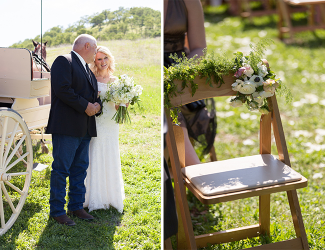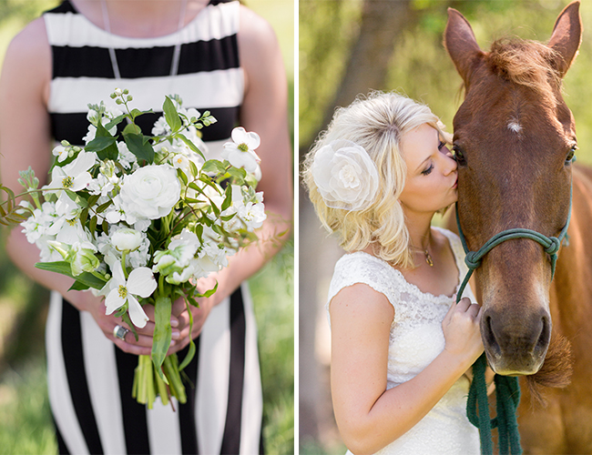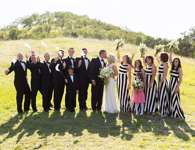 This black and white striped wedding on our wedding blog not only takes place on the bride’s family ranch but is also filled with DIY-ed details that definitely make the day one the bride & groom can call all their own. There’s classic details everywhere, the bride’s stunning lace gown and the neutral color palette, enlivened and personalized with black & white accents in the bridesmaid dresses and decor. A carriage ride to the ceremony and a twinkle-lit barn are just a few of our favorite things about this wedding, and the bride’s recollection of the day is another: