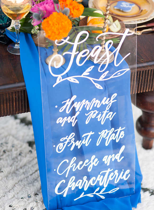 We used the 2017 Pantone color palette, along with the beautiful colors of Morocco for our color inspiration. We used rugs, pillow poufs, Moroccan tea, hummus, fruit, and cheese plates to help bring the inspiration to life!