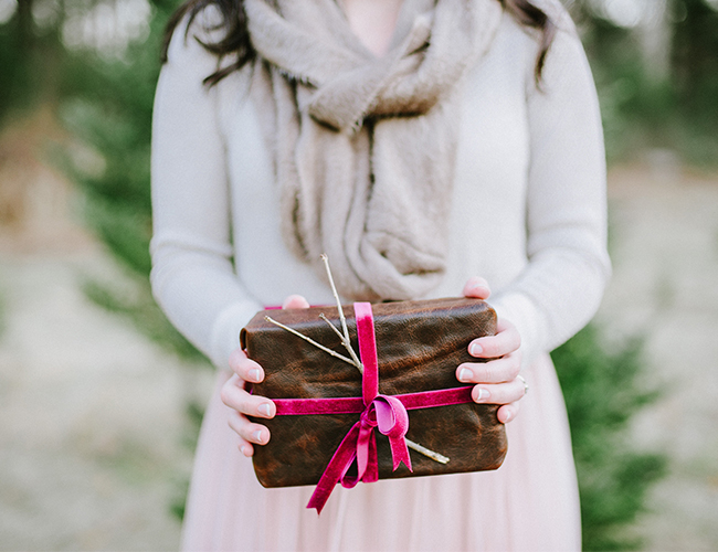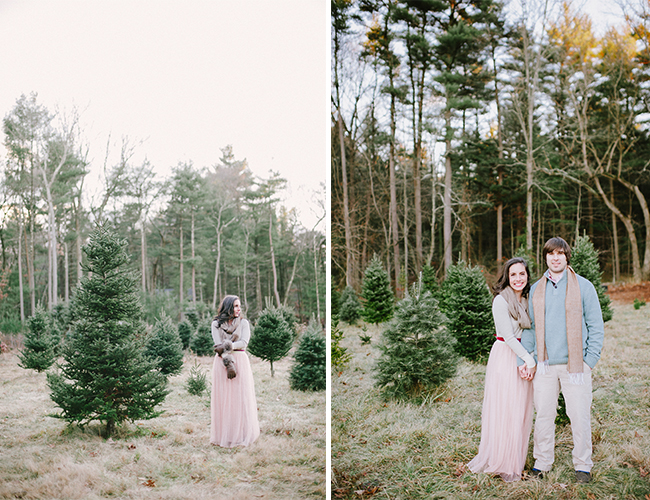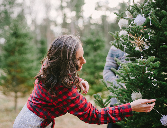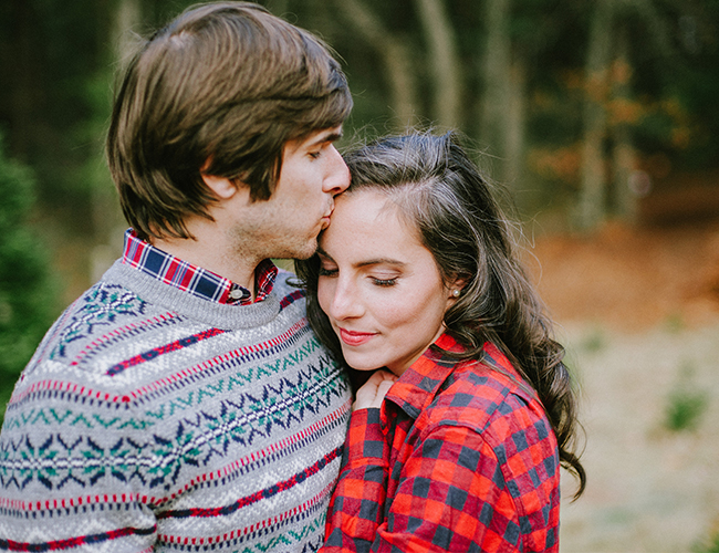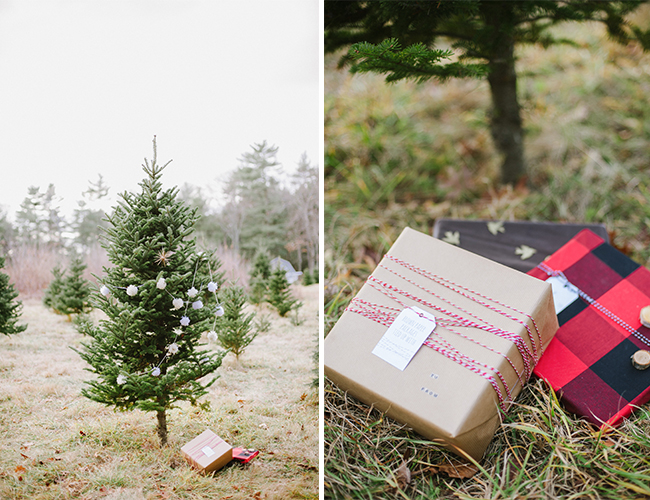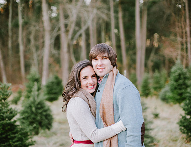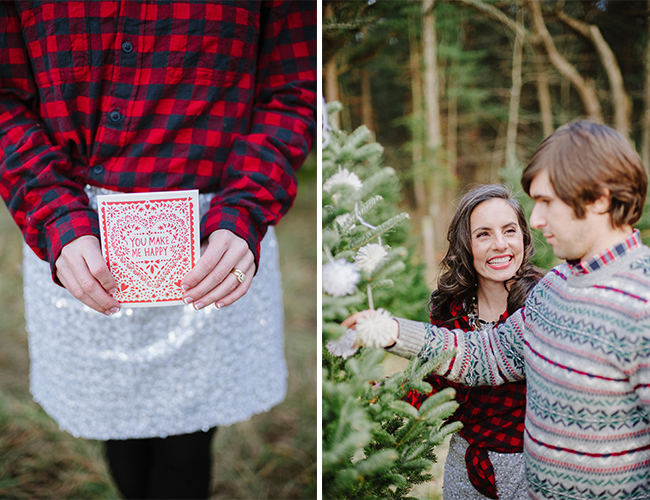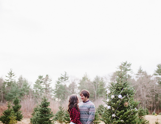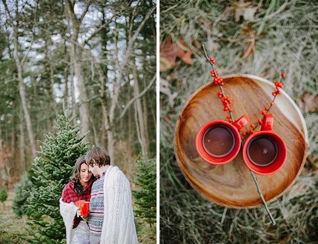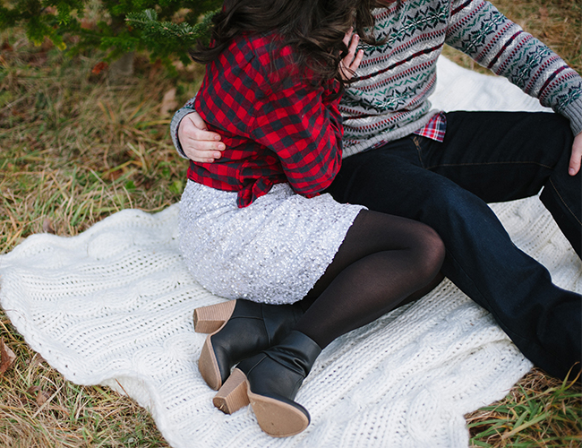 Christmas is in the air! Quite, litterally at this Christmas tree farm, where Lauren Methia shot this anniversary shoot on our wedding blog today! What better spot to snap a few shots for holiday cards than a beautiful Christmas Tree Farm! Emily from MStarr Event Styling + Design helped style the Winter themed shoot for this adorable couple with perfectly packaged presents and a cozy picnic setup. Between ornamenting a Christmas tree and sipping hot cocoa, Lauren captured the plaid-clad couple in all their wedded bliss! (They could be on our holiday card if they want!) And how cute are they in their holiday best? Sweaters and sequins are the very best part of seasonal dressing! If you weren’t already in the holiday spirit, this shoot will surely turn your Scrooge right around and have you decorating your tree in glittery garland and tying your packages in red & white string!
