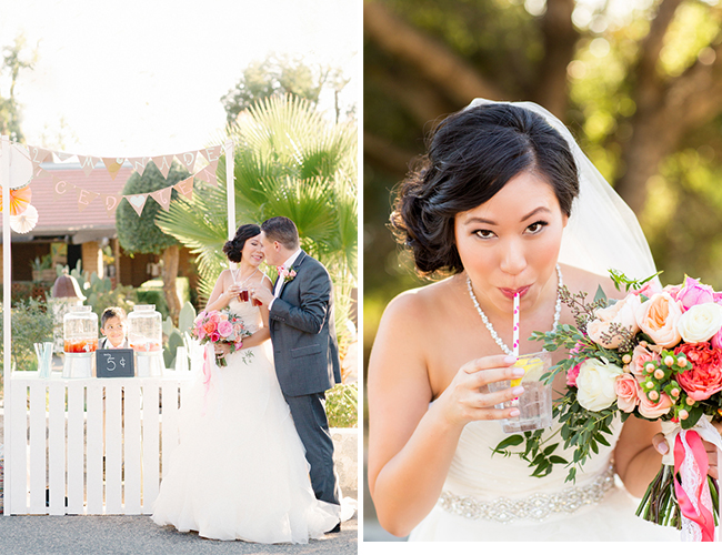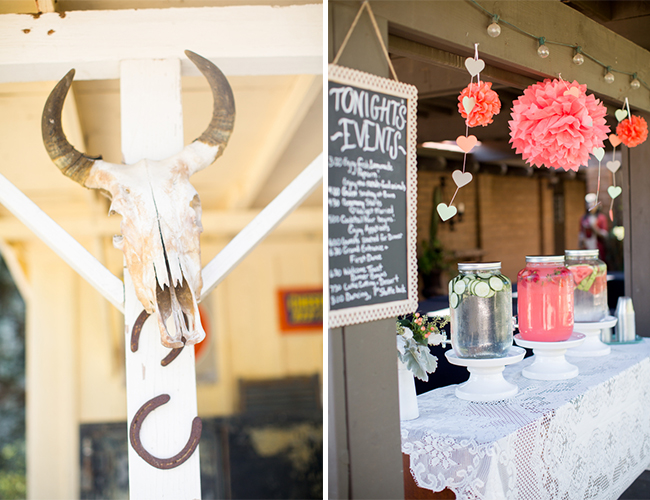Coral and teal and everything pretty, this ranch wedding on our wedding blog today is not to be missed! The bright colors popped against the desert backdrop and old fashioned ranch details. While the bride wowed in a ruffled ball gown, her maids backed her in stunning coral dresses and full pink and peach bouquets. Coca-Cola merchandise, animal horns, and old wagon wheels added character to the barn venue and allowed the bride and groom to incorporate vintage elements into the furniture and fun additions such as lemonade and popcorn stands. Yum!
