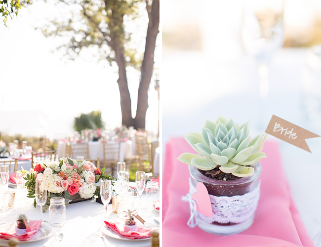 And yet, the wedding is supremely elegant with rose and peony filled floral arrangements to the gold reception chairs. DIY-esque decor was also incorporated via the teal table numbers, paper flowers, colorful pinwheels (love!), and tassel banners in the ceremony and reception areas. We’re sure guests walked away stunned and happy with their mini succulents (that acted as place cards) and endless treats after hitting up the cookie bar and popcorn stand, as the bride and groom walked off into the sunset. See how Britt Rene Photo captured the beautiful day.