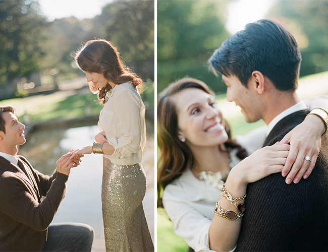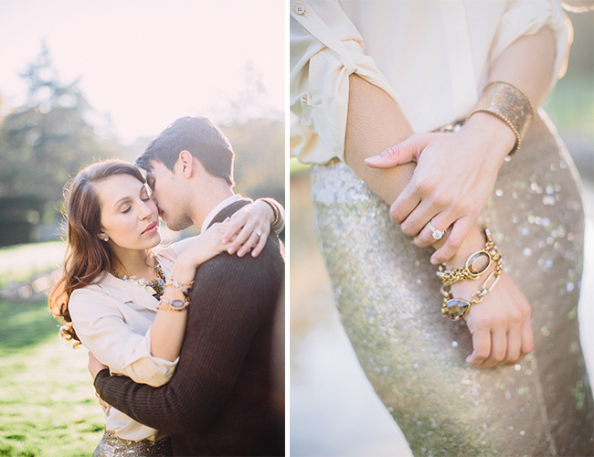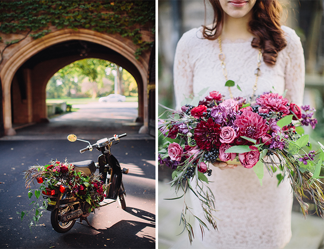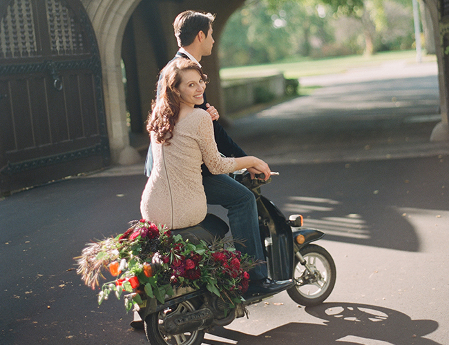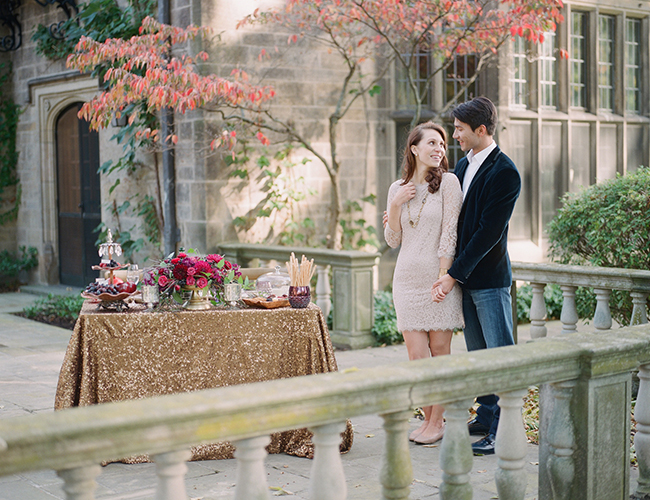 Brace yourself, this dinner proposal sure is pretty! Here to inspire a romantic and sparkling evening of your own, Blaine Seisser shot this proposal and dinner scene beautifully, with the help of models Whitney Martin and Joe Hill and the creative geniuses over at Mood Events. With both a sequin clad tablescape and bride-to-be this night sure did glisten. The deep red and purple color scheme adds to the already romantic atmosphere at the Edsel & Eleanor Ford House in Grosse Pointe Shores, Michigan (who wouldn’t be inspired by this historical venue?!), and the pomegranetes and pumpkins adorning the place settings make this a perfect setup for fall (hint hint if your proposal is down the road ;)! This entire shoot is so classy and beautiful, from the couple’s outfits (see below for details!) to the grape and cheese plate, we can’t get enough! Can we ride away on that flower crowned vespa please?!