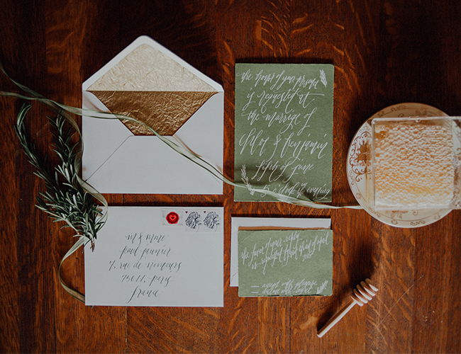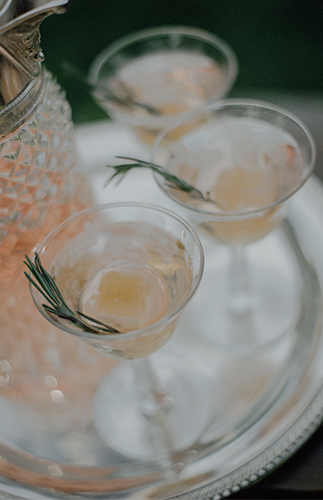 Earthy elements like rosemary and honey were incorporated into the event design as well. On the desk was a bowl of fresh summer fruit and our signature cocktail made with fresh honeycomb and garnished with rosemary. The elegantly rustic barely naked cake from Cake Fiction was drizzled with fresh honey.