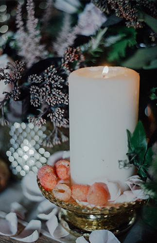The amazingly talented Laura Clare of Laura Clare Fine Floral Design brought my floral design vision to life! Lush greenery, soft pink rose petals, seasonal summer fruits and herbs adorned the wedding table. Lovely green passion vine crept down over the ivory chiffon table runner while warm light from the candles flickered and danced. I chose vintage stemware and china to go along with the theme.