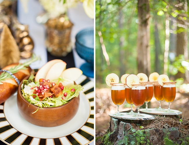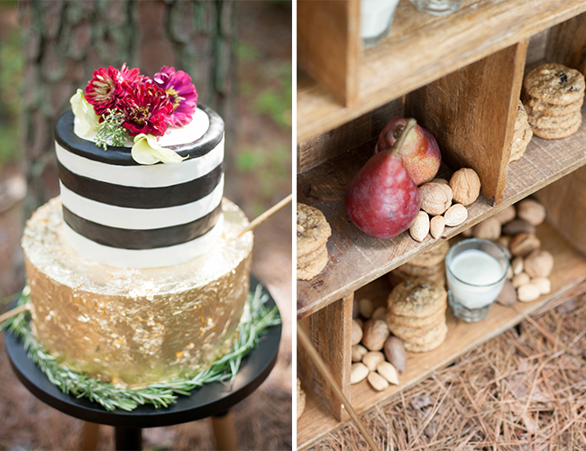 They sipped fall cider punch and enjoyed bacon and pomegranate seed topped salads, munched on crispy mushrooms, and snacked on delicious pretzel rolls. Of course shrimp n grits with a sprig of thyme were on the menu; what’s a southern soiree without this classic, delicious dish? Dessert was plentiful! Cranberry oatmeal cookies with glasses of milk (North Carolina’s official state beverage), pumpkin cinnamon-sugar coated beignets, s’mores and French macarons were available for sweet indulgence. The wedding cake helped the fete come full circle: it tied in the table’s black and white striped motif on its top tier and had a gold-leaf coated bottom tier with rosemary at its base, as was at each place setting. The entire scene glistened in the fall sun’s golden hour as the sun set on an incredible shoot!