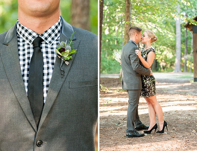The finishing touch for Zach’s grey suit was a boutonniere with florals that mimicked textures of the forest, including lavender spiky eryngo, accented with an arrow pin. This military man’s black and white checkered shirt complemented Hope’s sequin mini dress. (What’s a celebration without some sparkle?) The surrounding area allowed her green eyes to shine and her cute faux fur vest was purposely sleeveless so Zach could do the rest of the cuddling when the fall air got too chilly! A simple bouquet of all white snapdragons popped against her statement dress.