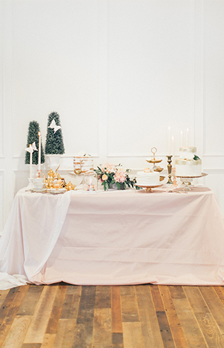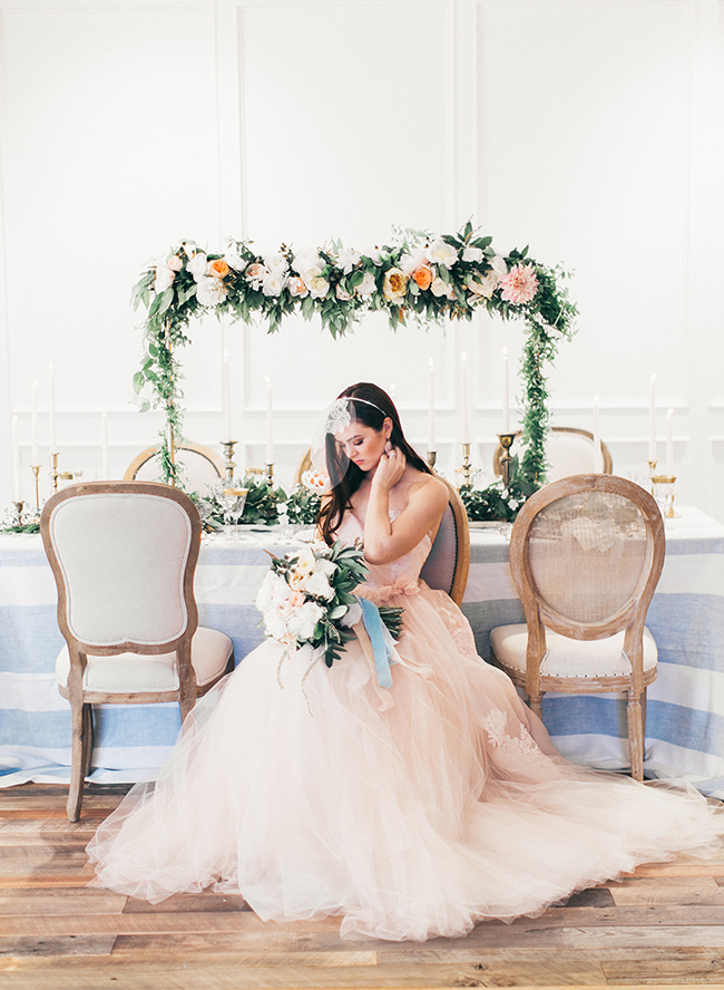 Keeping consistent with the idea of a French inspired shoot, we envisioned our bride as an elegant French woman on her wedding day. Celebrity hair and makeup artist,Joy Castandeda, enhanced our bride’s natural beauty and feminine features perfectly with soft makeup and classic hair. She then slipped into Claire La Faye‘s blush Swan Song gown, and our vision was complete.