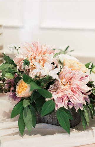 Together with Meagan Vos of MV Florals, we designed a unique floral centerpiece that lined the table in length and provided lots of height. Meagan added beautiful florals and greenery to the custom structure and made it look like a true Parisian garden right on top of the table. We accented the structure with vintage brass candlesticks for romantic light, and set the table with hand-dipped vintage gold charger plates, crystal glassware and salt cellars, and natural linen napkins.
