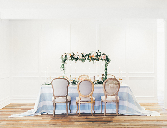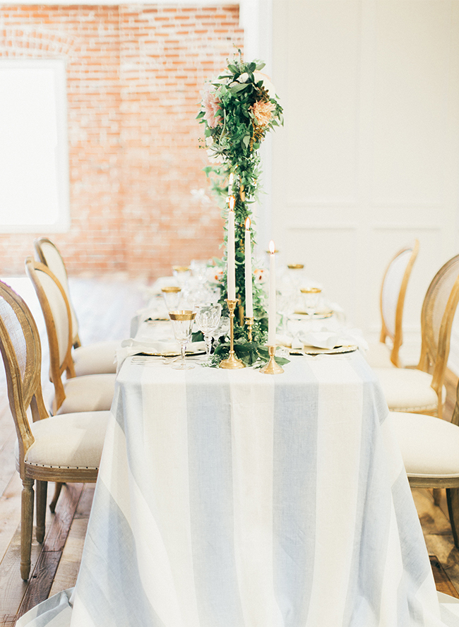 The second story is where we set the French inspired dining table, adorned with the most amazing French-inspired striped La Tavola Fine Linen and Archive Rentals vintage chairs.