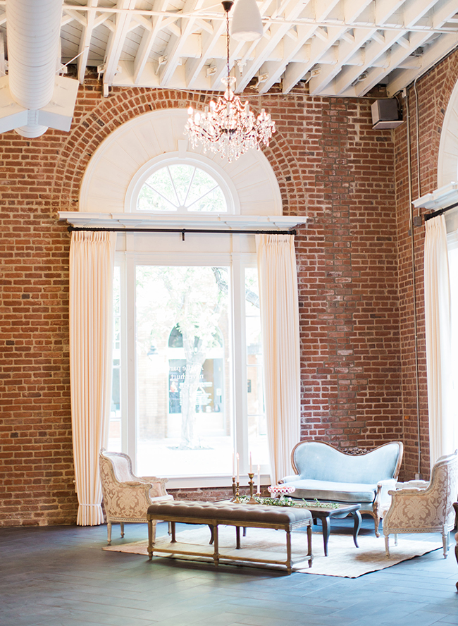The venue itself is a newly renovated, historic building that has been around since the 1920’s, when it was frequented by celebrities like Lucille Ball. This history, mixed with the open beam ceilings, exposed brick walls, and arched Palladian windows of the Estate were incredibly inspiring to us. The clean lines, stark white trim, and symmetrical architecture provided the perfect spot for us to create a French, industrial wedding, and we can only imagine what it would be like to design an entire real wedding in this space. It is gorgeous and sophisticated and is set up to host parties big and small.