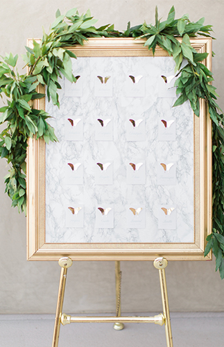 The intimate ceremony was set in the grand entrance of the Estate, with ceremony chairs draped in natural, flowing linen fabric and crystal chandeliers lining the tall ceilings. Our backdrop was made of a simple oversized topiary, reminiscent of ones seen lining the gardens of Paris. A few white butterflies accented the topiary, a subtle French theme we incorporated throughout the shoot.