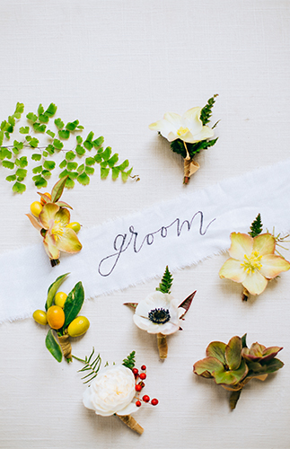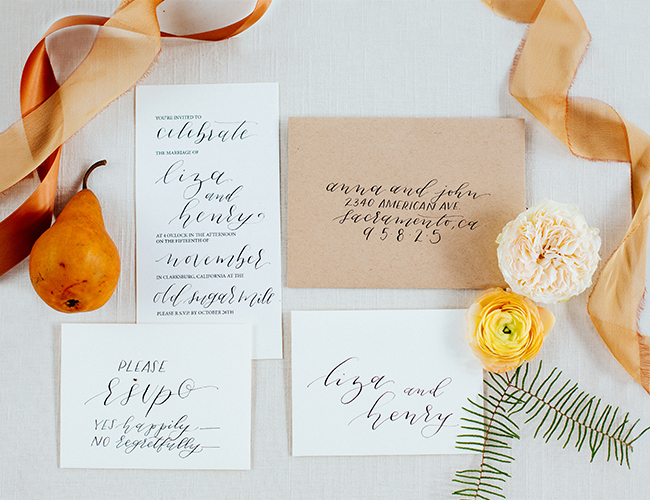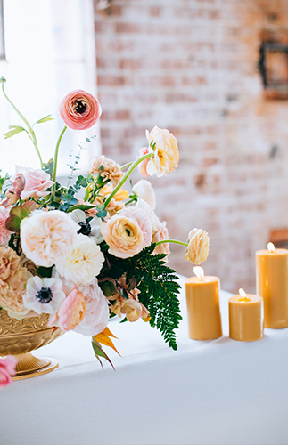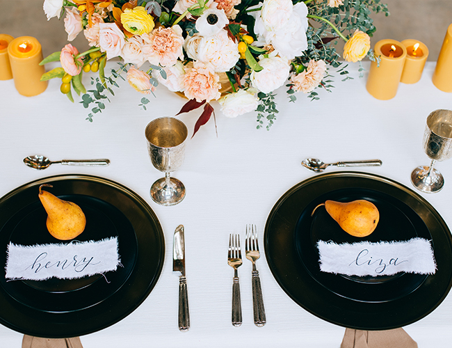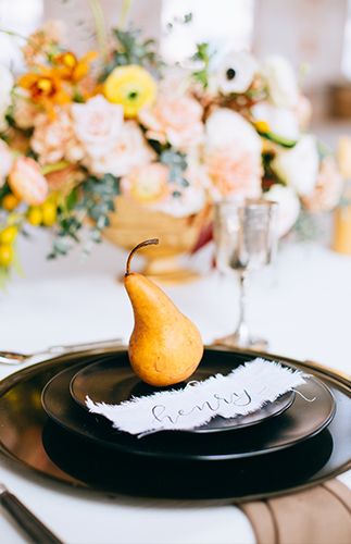 The color palette was inspired by fall. However, I wanted to do a look that could be done anytime of year. Rather than having the look scream fall, I wanted it to softly elude the fall colors and tones. Thuy and Nikki, the florists, did a great job lightly including leaves and fall colors in the arrangements. They also added some seasonal fruit which was so beautiful! I played off of that idea by also adding the golden pears to give the tablescape a touch of fall. So, while the fall colors are still there, they are toned down and soft, giving the overall shoot a much more mature look.