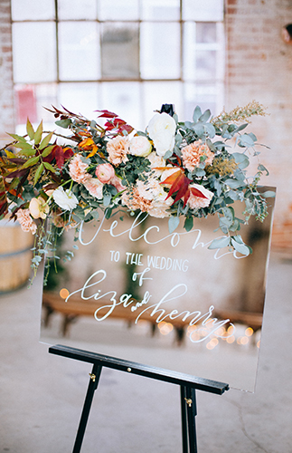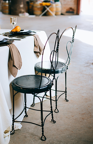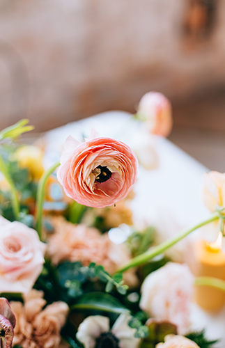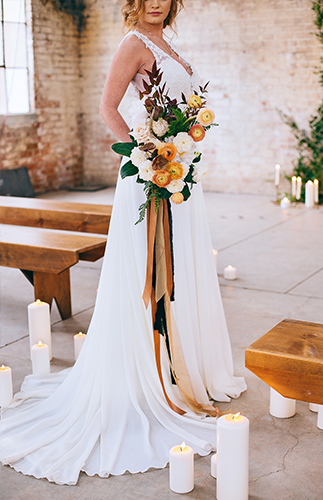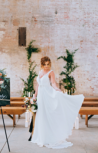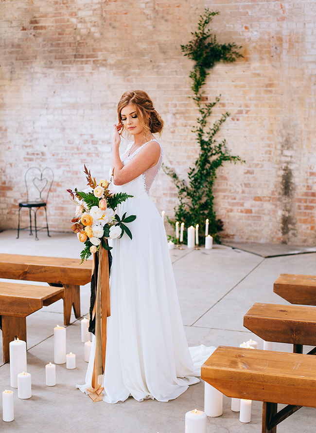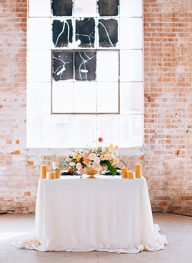 The rentals were simple and imperfect. Ashley, my wonderful calligrapher, did a wonderful job keeping the paper goods simple and clean. Apart from the venue having the industrial look, I also incorporated that element through metal pieces of furniture. My choice of linen for the sweetheart table was a soft, breathable and textured fabric that organically rested on the floor. I gave the napkins a tossed look to give the table an additional relaxed element. Continuing with the organic style, my amazing florists created natural garden style arrangements that perfectly tied into the shoot. The bride’s dress and hair also reflected that effortless and laid back look.