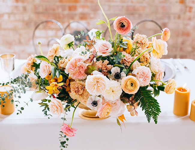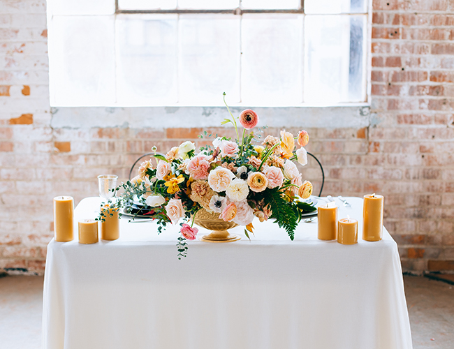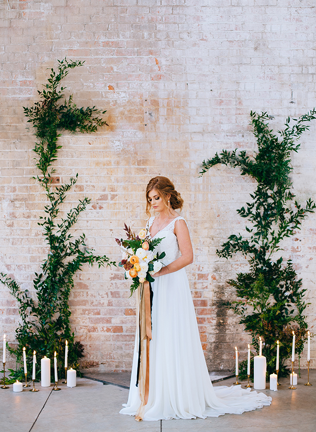 When a wedding inspiration photoshoot goes really well, it sparks so many beautiful new ideas! This is one of those… Anna Perevertaylo teamed up with some pretty talented vendors to create this industrial golden wedding inspiration. And boy! is it magical. (Heart flutters type of magical). We see gold a lot – but we don’t see gold florals a lot. Here, in combination with soft pinks and creamy whites, they are seriously stunning. Try not to do a double take, we dare you!