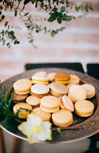 I also liked the idea of having a sharp contrast by adding black to the color scheme in order to create dimension and depth. Having the black touches allows the soft warm colors to really pop. Which leads me to my model. I was thrilled to come across Liza! Her warm hair color and skin tone perfectly fit in with the look we were going for! My sweet macaron baker also played with this warm and dark color palette by providing cute and absolutely delicious cookies.