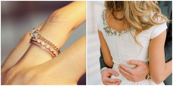 We’re always looking for new and different trends in weddings and right now we’re loving these mismatched stacked rings and jeweled, capped sleeve wedding dress!