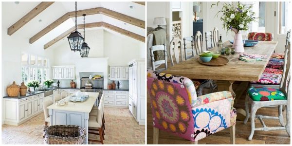 [Amazing kitchen with high wood ceiling beams with white wash brick flooring + Mix and match patterned upholstered dining room chairs]