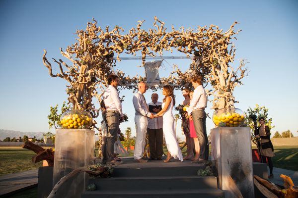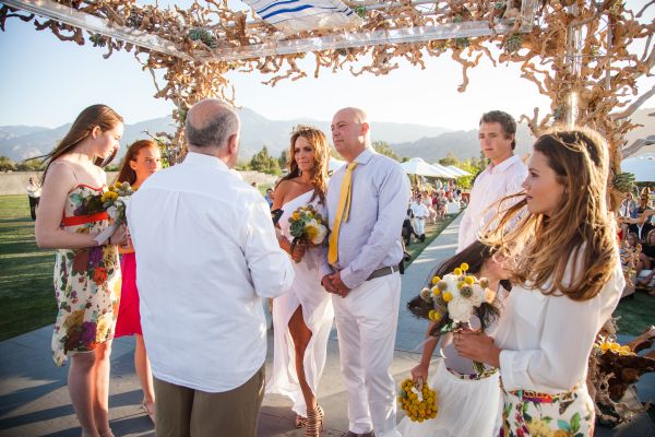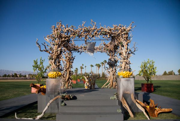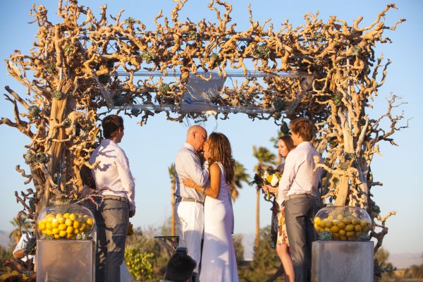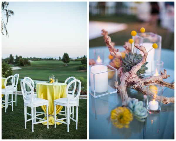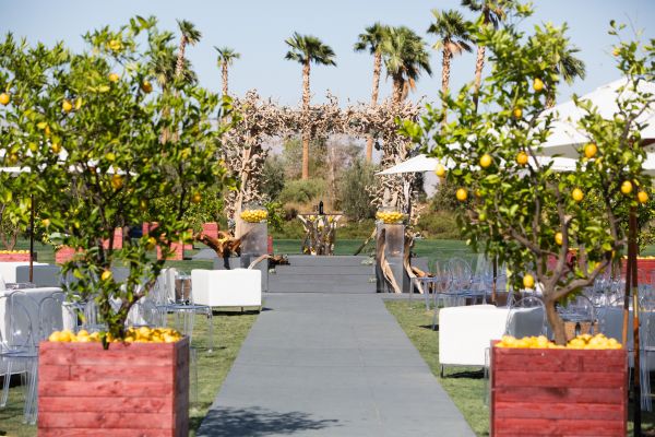 There are two guarantees with a wedding ceremony in gorgeous Palm Springs, California: majestic scenery and sunny weather!  From refreshing lemon accents to custom fans and umbrellas for their guests, this couple knew the perfect way to cool down and have a good time!  In addition to their practical details, we’re completely obsessed with their personalized touches…don’t miss that amazing dance floor with a hand written note to the bride from the groom! We’re just dying to share this radiant wedding created by The Special Day with bright floral accents by Chris for Fiori Fresco in Palm Springs!