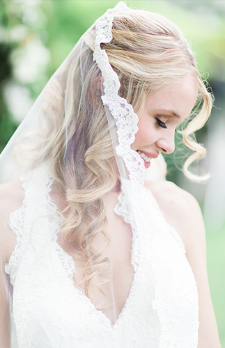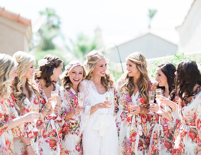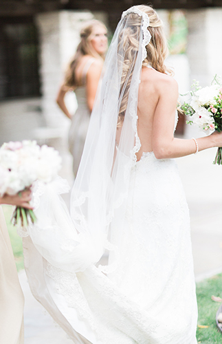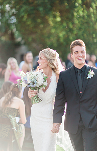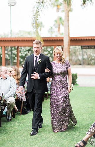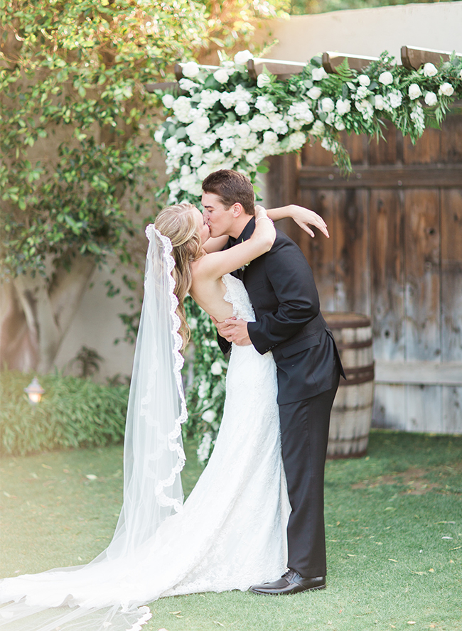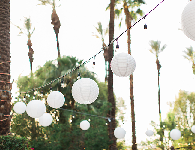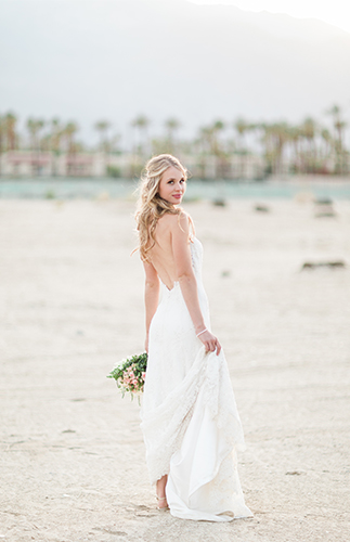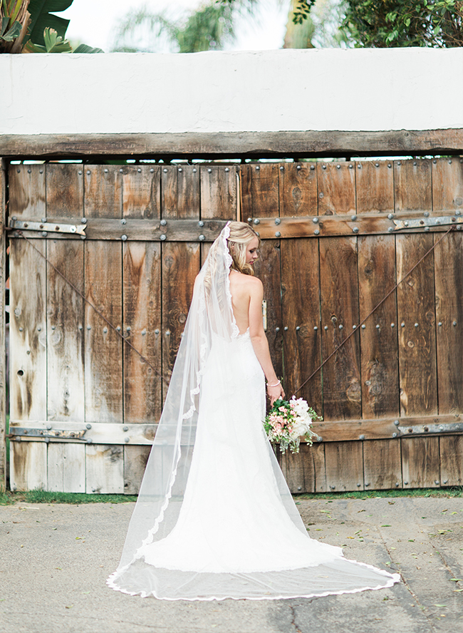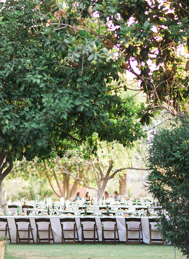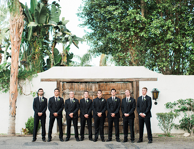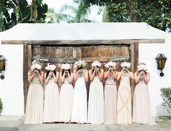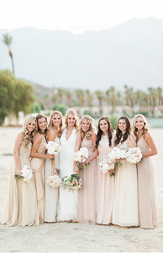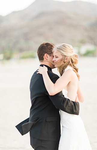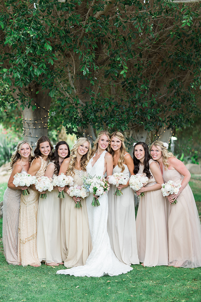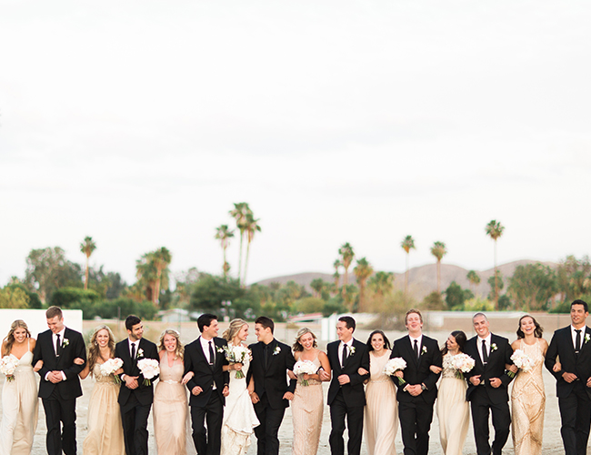 This ivory & blush beauty on our wedding blog today took our breath away as soon as we first set eyes on it! Though our love affair with it pales in comparison to that of the beautiful bride and groom! Their Palm Springs, California wedding at the Cree Estate was a romantic outdoor event. Guests watched them wed in a quite-perfect palm tree shaded ceremony, and celebrated under a sea of market lighting. The groomsmen tugged at our classic-loving heart strings in black tuxes while the bridesmaids stunned in a mix of embellished blush and nude colored gowns. And then there’s the handsome groom donning black on black and the bride who looks like she just walked off the catwalk in her halter lace wedding dress and cathedral veil. We’re dying.