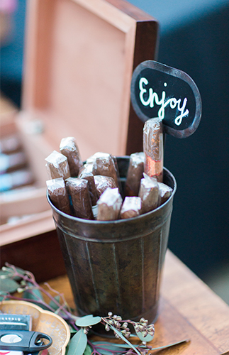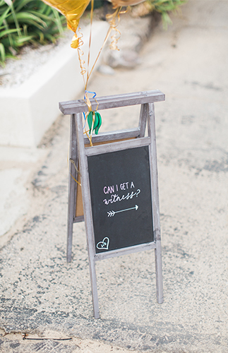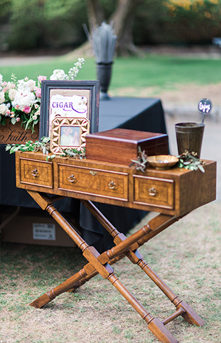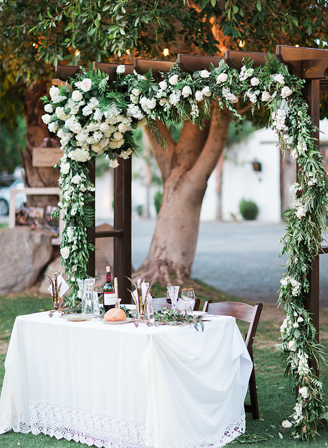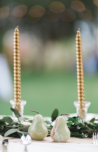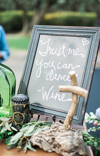 Wine bottle centerpieces and fresh baguettes on the rectangle reception tables nodded to the bride’s Italian heritage, and ceramic pears on the sweetheart table served as the perfect pun to the the new “Pearrings.” Cutesy sayings such as “Can I get a witness?” dotted the cocktail & reception areas on chalkboard signs. An asymmetrically covered ceremony arch & rustic wooden doors created the perfect photo-opps, while the sandy desert setting made for some magical moments of its own.