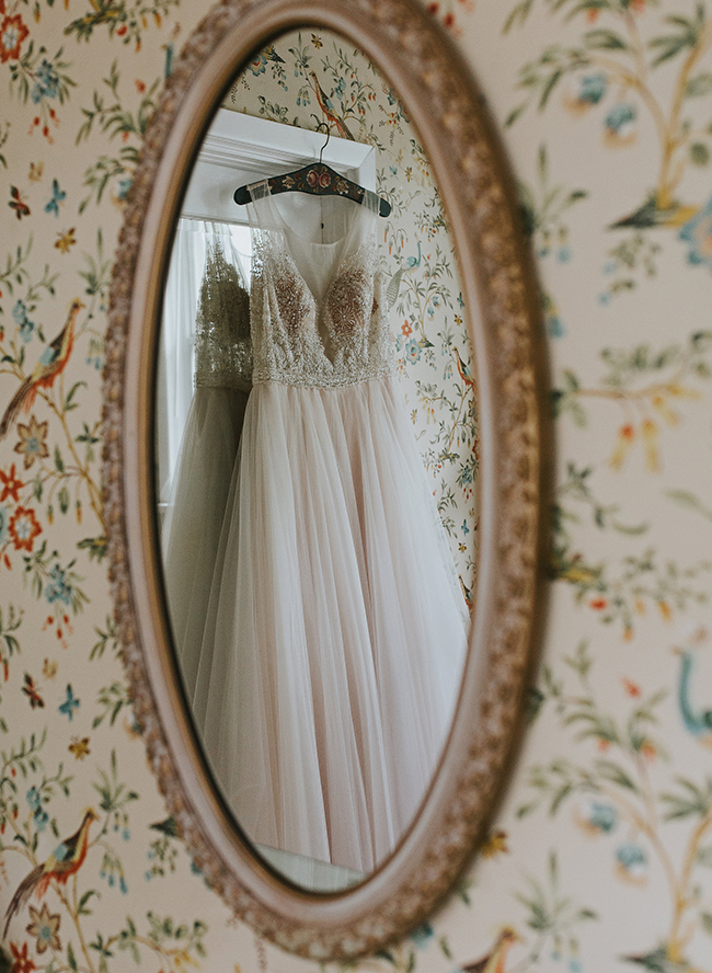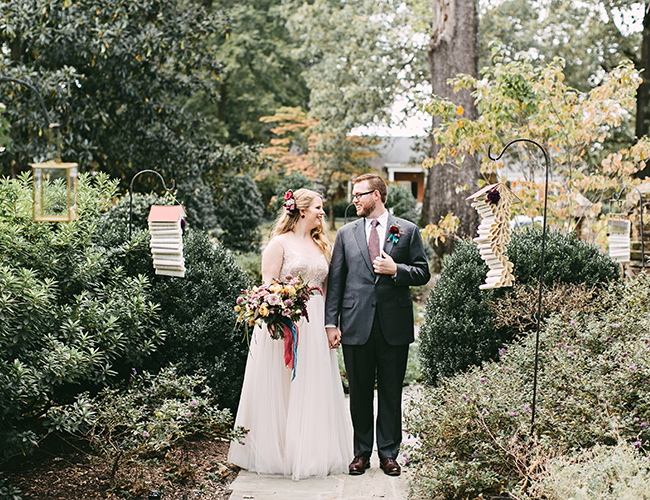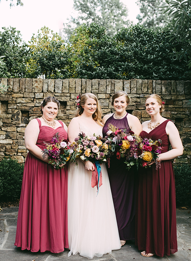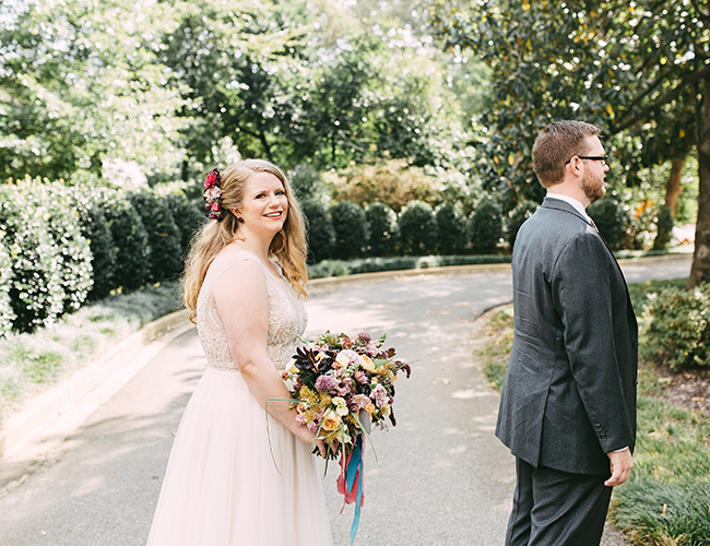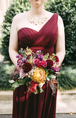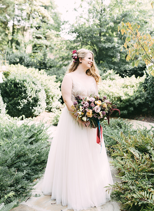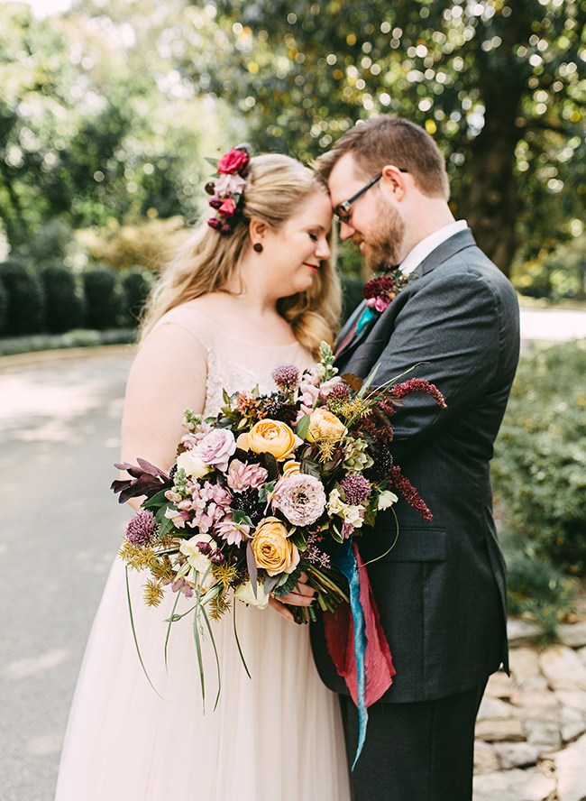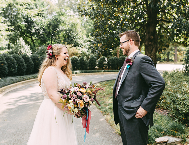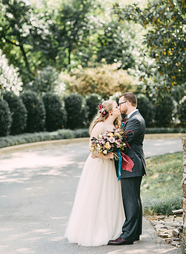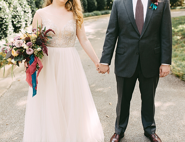 This wedding makes our hearts sing! It’s full of color, personality, and delectable food! What more could you want? The jewel tone restaurant wedding (yes, you read that right) takes place at a stunning and unique restaurant in Memphis, Tennessee. Burgundy, teal, and lavender pop against the naturally green venue. In addition to statement making florals, the bride’s Watters gown is in a league of it’s own! Her and her groom have the sweetest first look, ceremony, and reception all caught on camera by Kelly Ginn Photography.