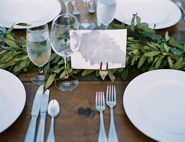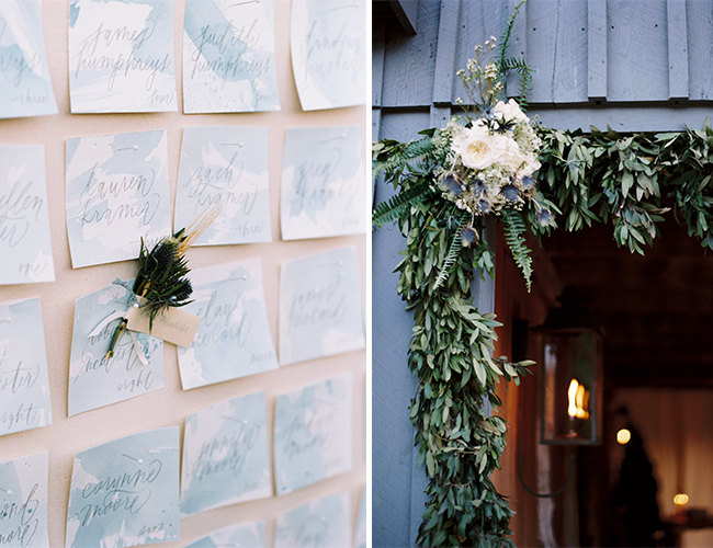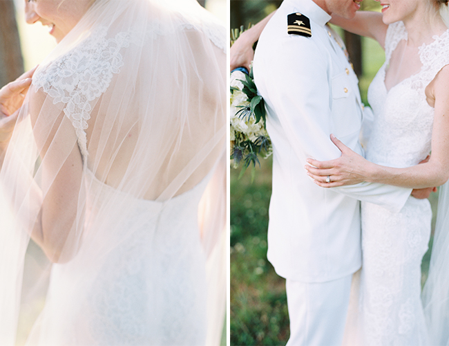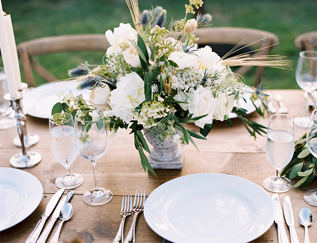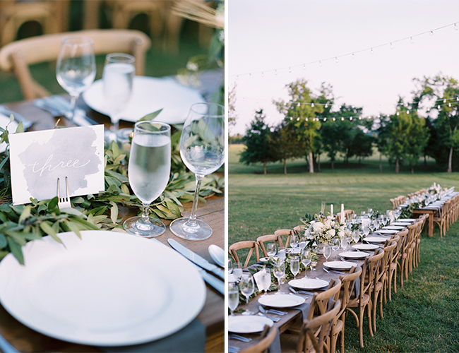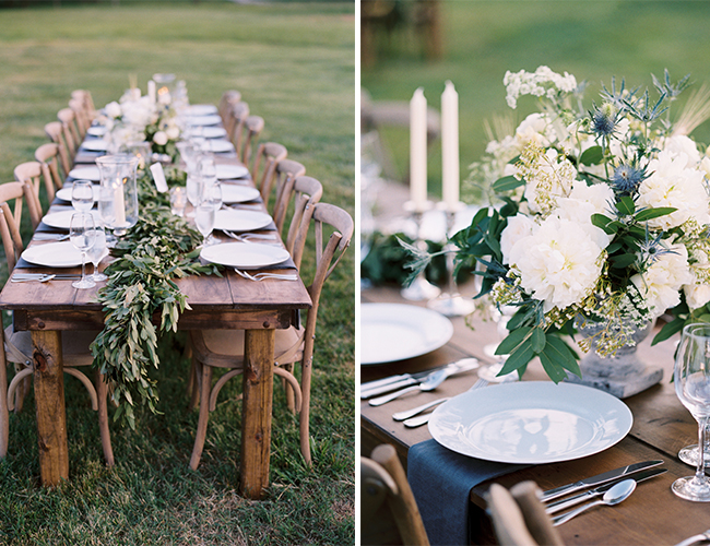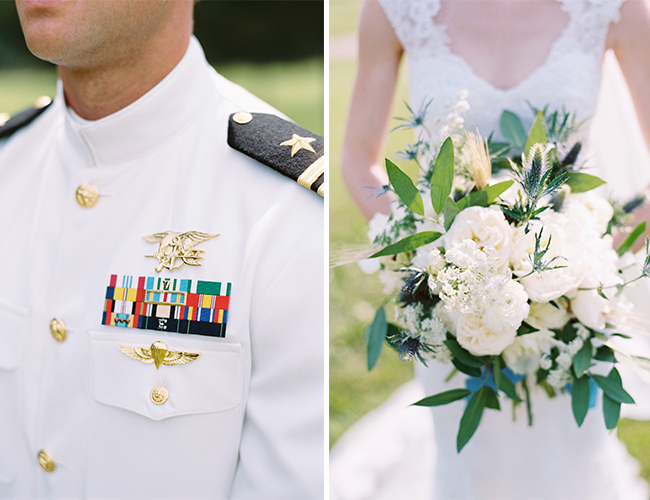 “Elizabeth and Caleb were married at the family’s private estate in Tennessee. The bride wore a stunning Harper gown by Monique Lhullier and carried a bouquet of white peonies, ranunculus, garden roses, blue thistle, queen anne’s lace, bay leaf and wheat. The groom and his groomsmen wore their formal Navy whites. Following the ceremony, guests enjoyed cocktails in front of one of the property’s barns, and then took their places at long wooden farm tables adorned with bay leaf garlands and simple white candles. A filet dinner was served under the cafe lights as the sun set. A bluegrass band from the bride’s hometown serenaded guests during dinner.”