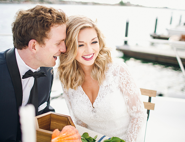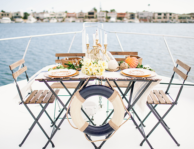 What takes a nautical theme to a whole new level? Maybe a Newport Beach location? Or, moreso, a yacht venue. This shoot on our wedding blog today is meant to inspire the perfect seaside wedding. Complete with beachy waves, seafood fare, and sailing inspired decor (cue the life rafts and rope knots), it’s a wedding made for the water. Michelle Flores & Dillon Driscoll set their sights on the Balboa Bay Yacht Club for the shoot destination and brought in the perfect stylized decor to match!
