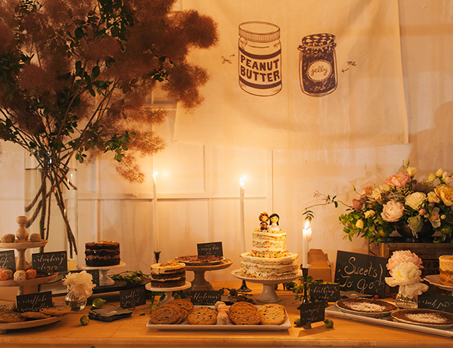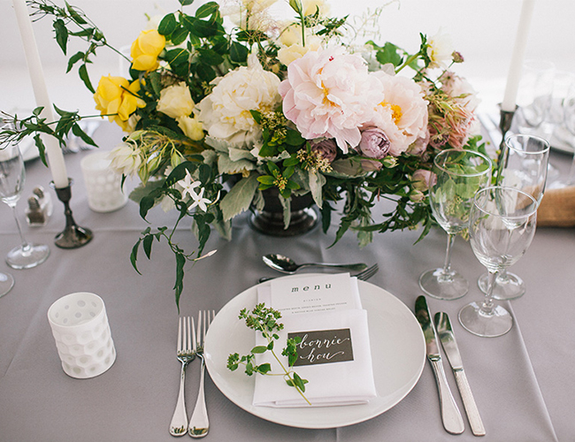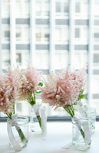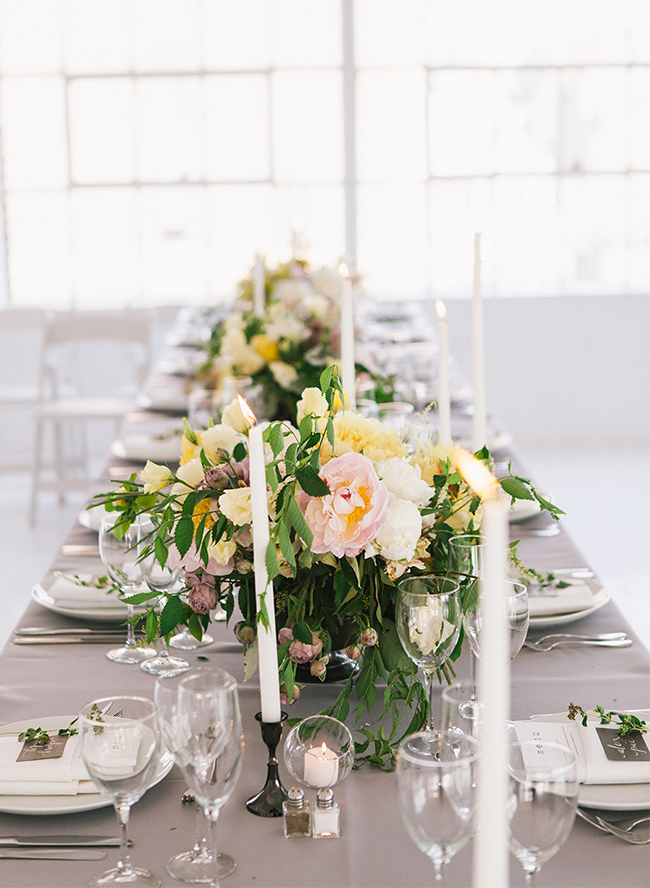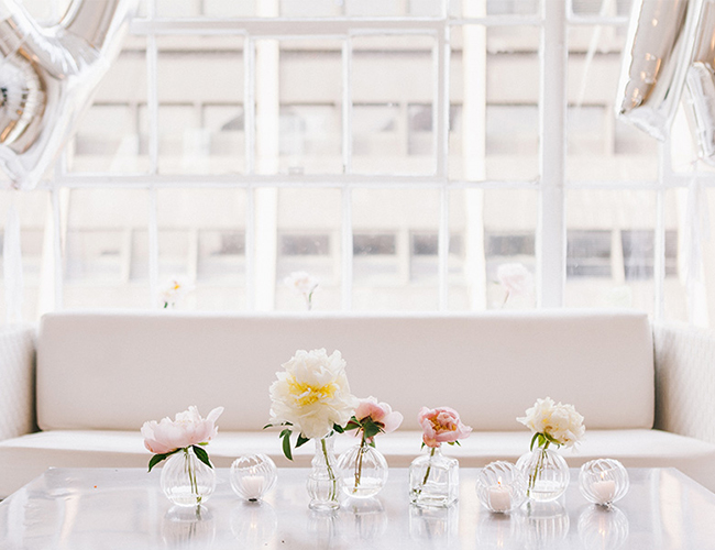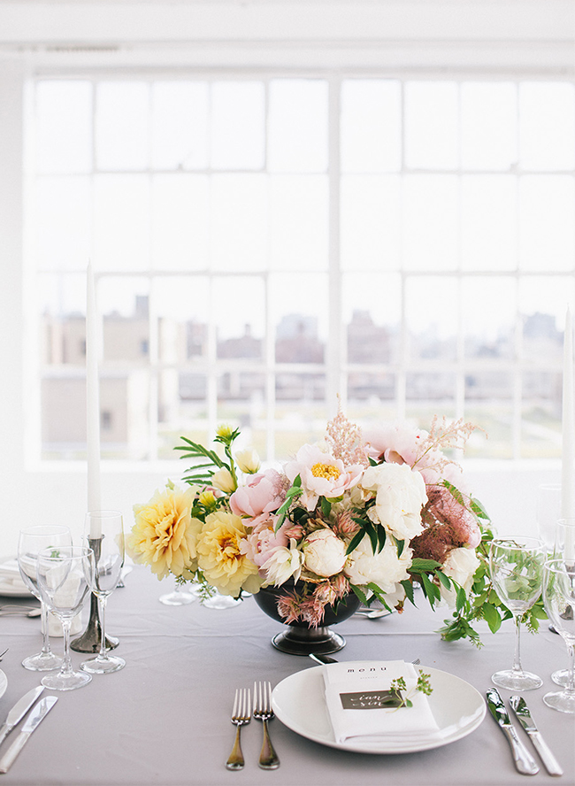Following the ceremony overlooking the skyscrapers, guests enjoyed a reception in a space that was the perfect blank canvas for the beauty Bespoke Only designed. What’s more? Bespoke Only created those jaw-dropping floral arrangements and bouquets too! The combination of soft pink and yellow echos the city in Spring. The Peonies and sprigs of Blush Astilbe make our hearts sing! The reception was lit up not only with market lighting, but the night lights of the city streaming in. Grey linens, simple place settings, and romantic candlesticks matched the immaculate design. It was a picturesque day, topped off with a Funfetti naked cake. We are in love.