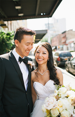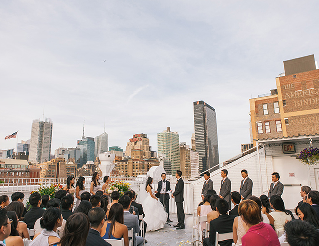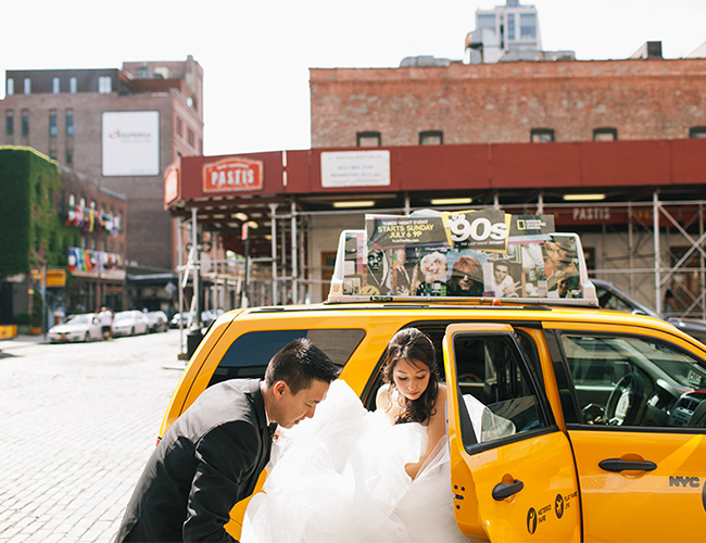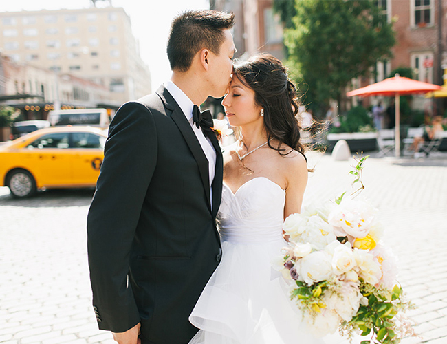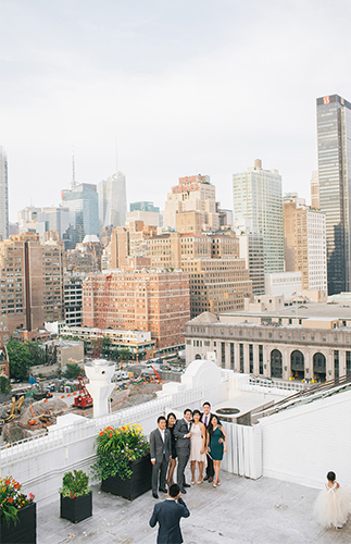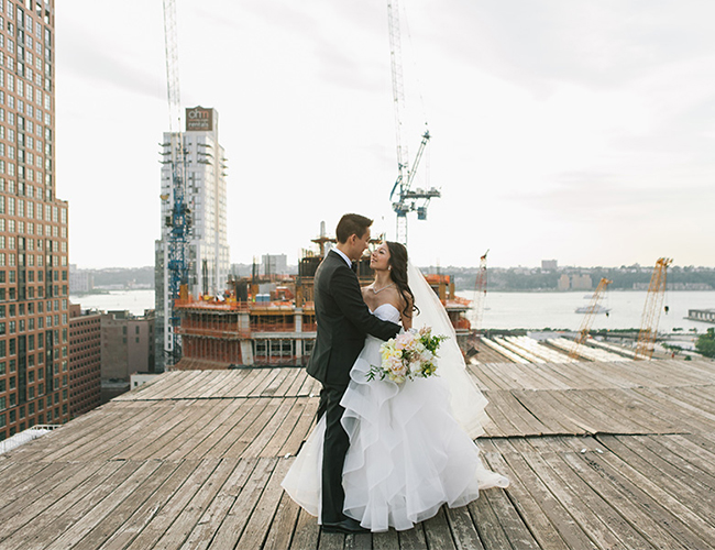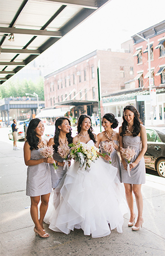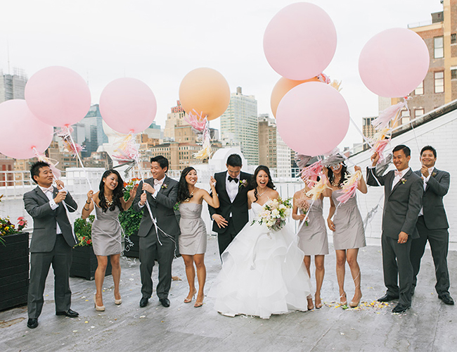 This New York City wedding on our wedding blog today is an actual dream! The bride’s Hailey Paige gown, the loft venue, the giant balloons, and that VIEW! We could go on. So we will. The beautiful couple took to the streets of NYC followed by their post wedding party, while Shannen Natasha, captured their parade. It was a scene from a movie. After the first look and some fun shots in the street, they piled into cabs (gracefully, of course) and Angela and Kenny said their vows atop Studio 450.