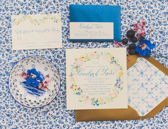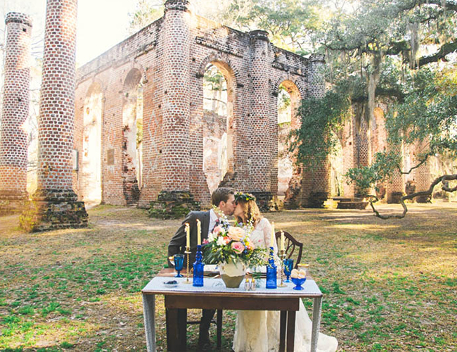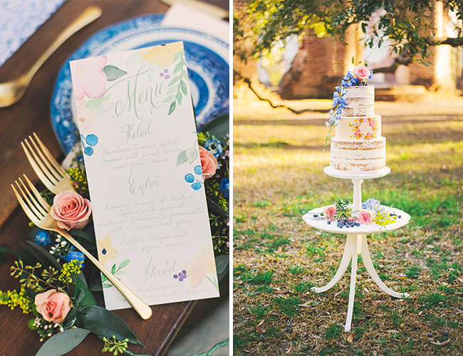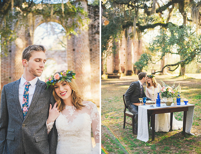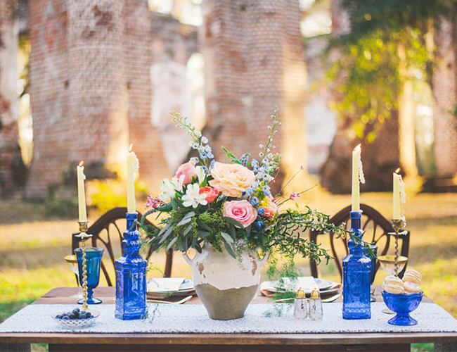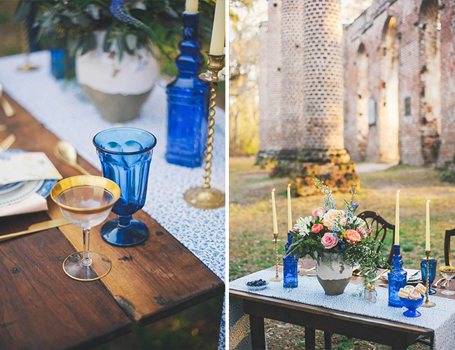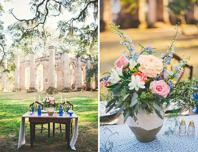 Our inspiration for the shoot came from the look of the Old Sheldon Church Ruins. We came across the cobalt blue and cream vintage plates at an antique store and we thought it really reflected the look and style of the ruins. We wanted to use pastels as well because it is spring. We shot the shoot at sunrise so the sun would come up behind the ruins and allowed for the gorgeous light! We had an amazing designer, Gabby Anderson of Indigo and Company, come up with a design for the stationary which gave the cake designer, Jen of Cakespirations, the idea for the cake!
