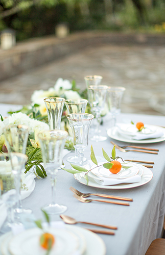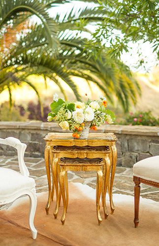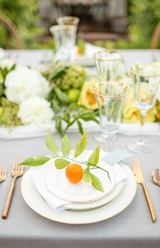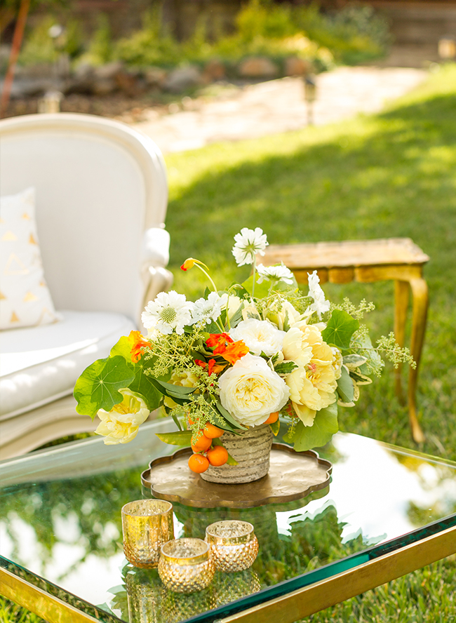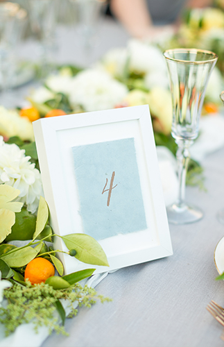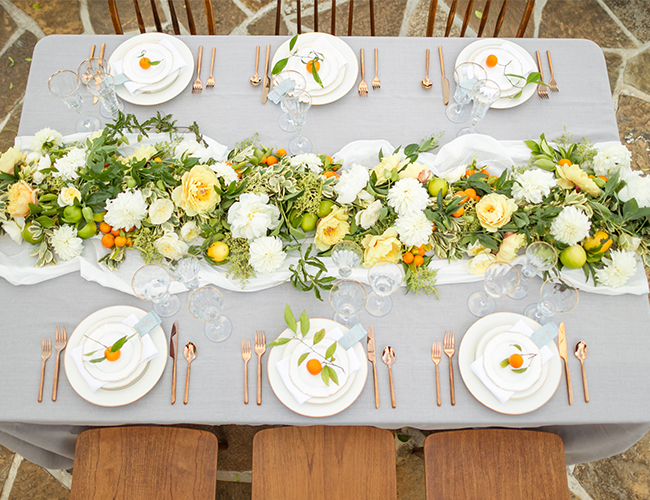 We love the light and pretty tabletop decor including fresh oranges and a full garland of greenery and garden roses. The florals were consistently beautiful throughout the lounge areas, cocktail area, and reception filled with proteas and peonies. It’s chic, bright, and timeless, and perfect for an October wedding. To top it all off the floral & lemon decorated cake is refreshing and beautiful.