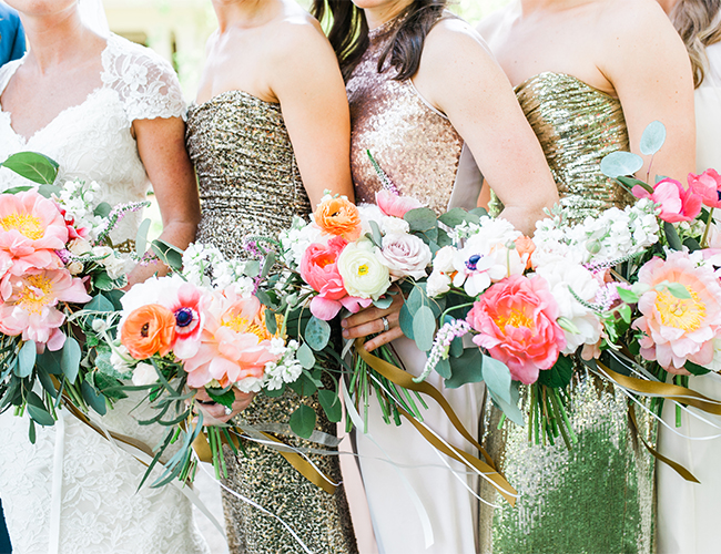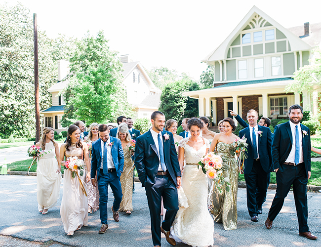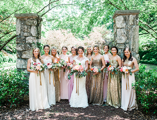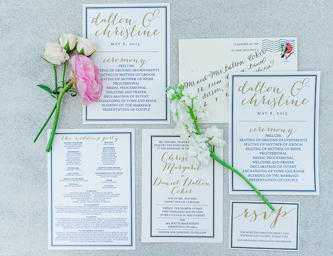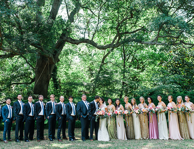 There’s little we love more than a little gold glitter, some mis-matched bridesmaid dresses, and a couple that is head-over-heels for one another. Check. Check. Check. This classy navy + sparkly pink metallic wedding on our wedding blog today is a winner. The South Carolina setting ∫ with overwhelmingly large oak trees shaded the beautiful summer ceremony. The bride & groom showed their state pride on custom painted wine glasses and party favors. They said “I do” and danced the night away with one numerous, and very beautiful, wedding party to usher them into their future together.