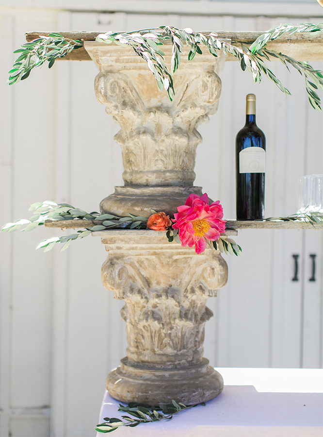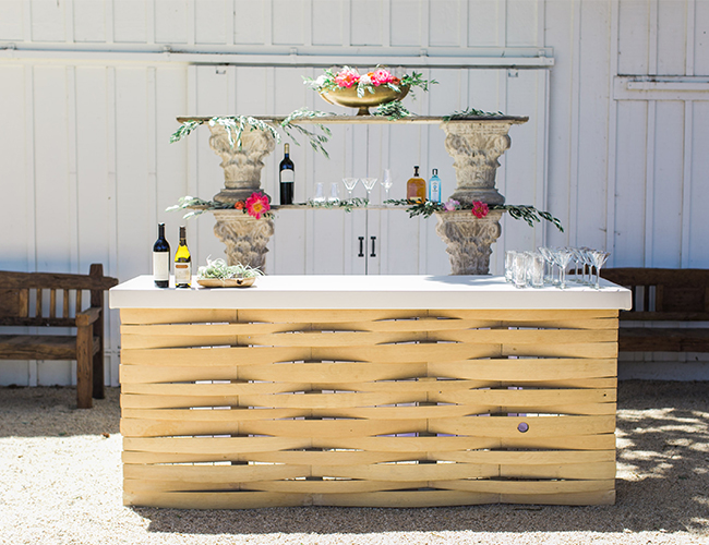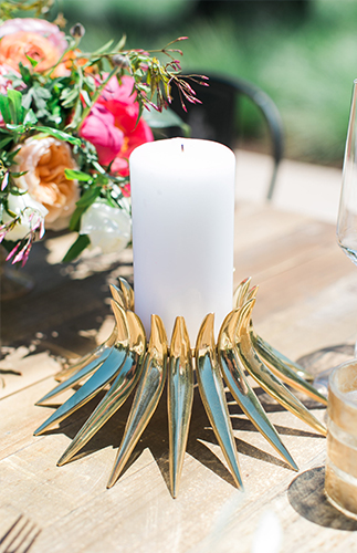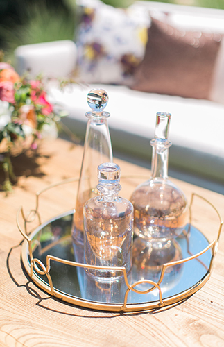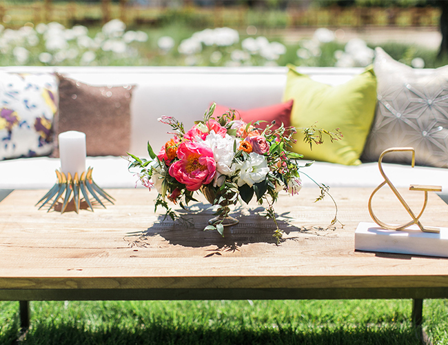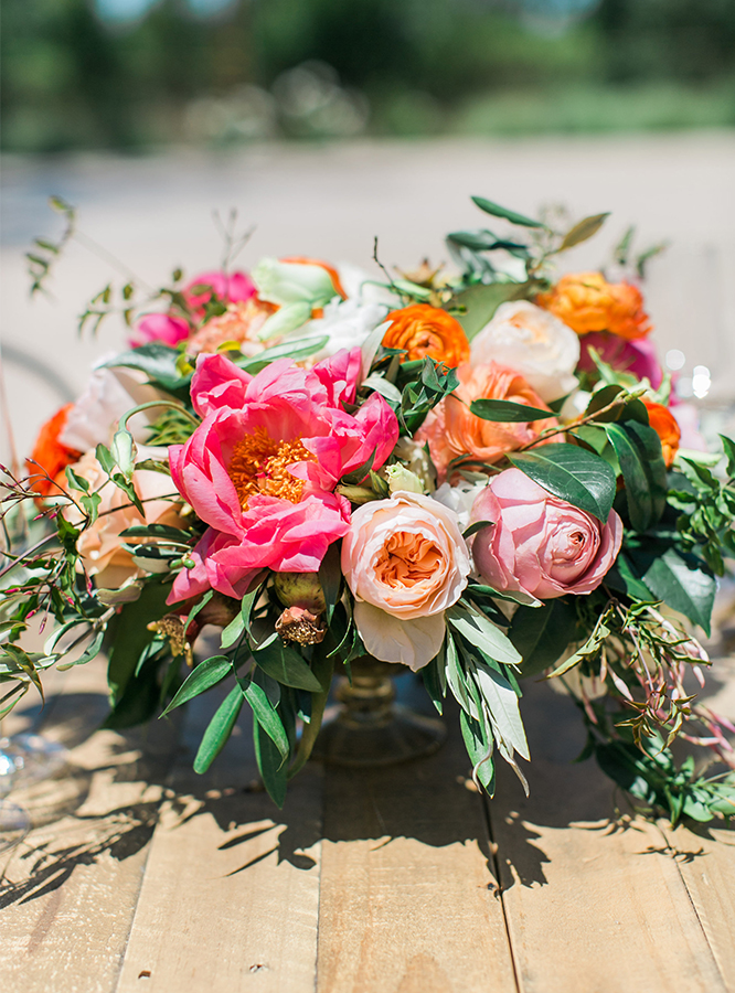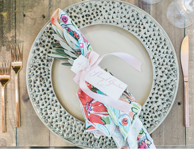 Roses, magnolias, and coral charm peonies stole the show with their vibrant hues at the ceremony site, the bar, and throughout the tablescape. The vivid floral arrangements were balanced by chic furniture and luxurious rose gold flatware. By mixing metallics, as well as the combination of rustic elegance, this shoot goes to show that trends aren’t always there to follow. There’s a certain beauty in mix-and-match décor!