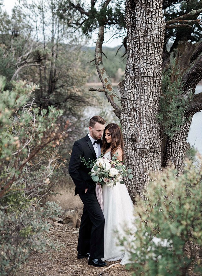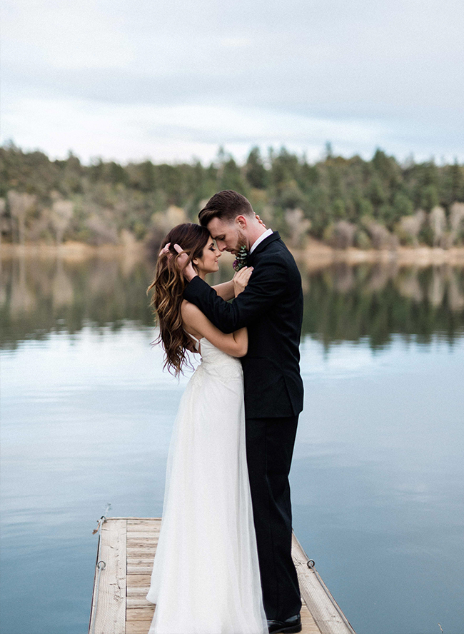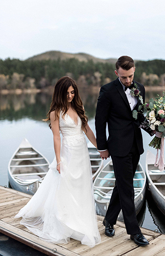 The vision for this elopement was inspired by the beauty of Winter. Lakeside with a lush woody backdrop created the most intimate setting. The water was calm and the cool, crisp winds were perfect ‘cuddle weather’ for the bride and groom. The bride was dressed in a flawless flowing gown, surrounded by tall pines and a quiet, peaceful lake.