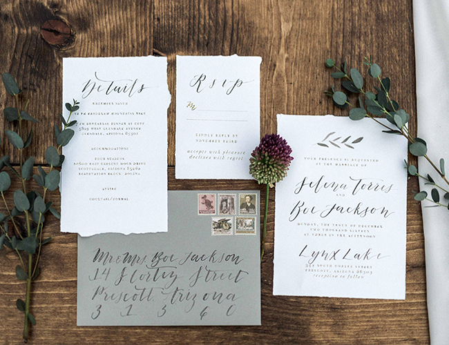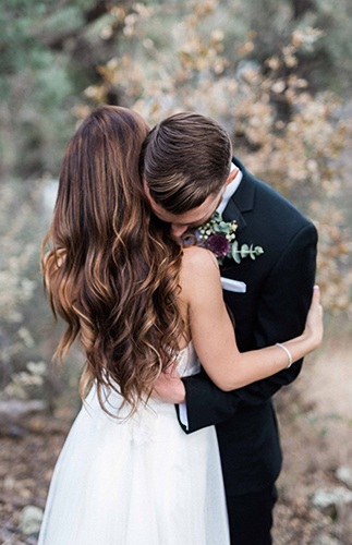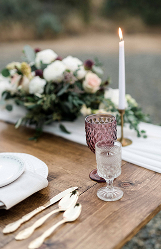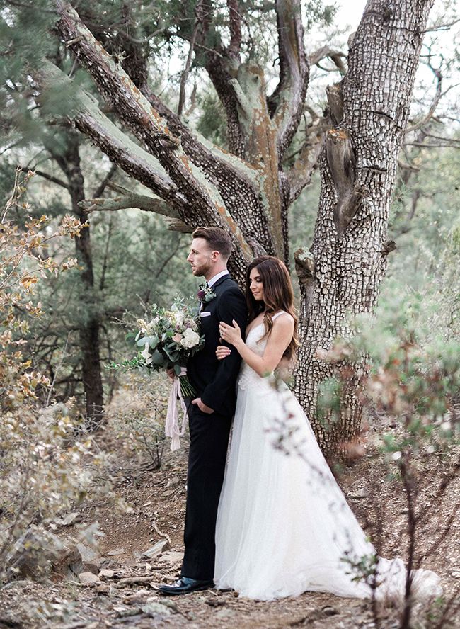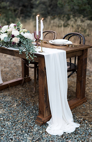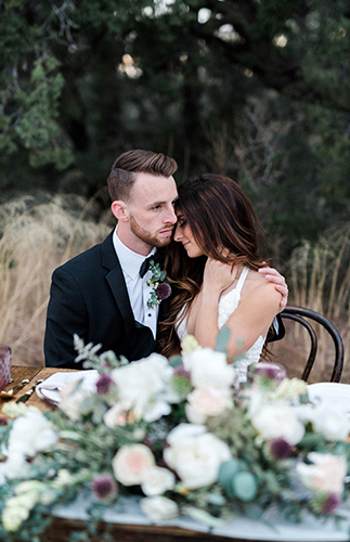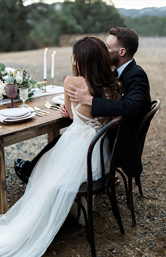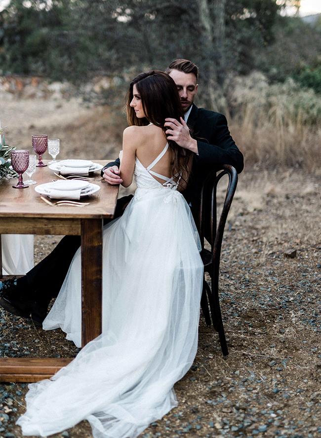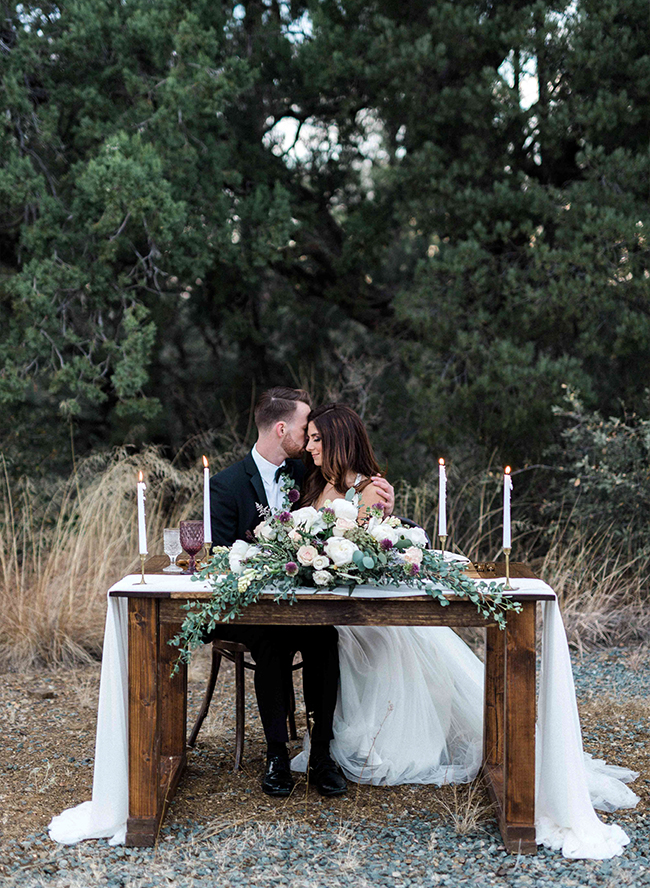 The groom wrapped his delicate bride in a cozy fur blanket and held her close. Romance was the primary vision, and the vibe of the afternoon was just that. The pair finished the evening off nuzzled at their rustic sweetheart table covered in warm tones and gorgeous florals. The textured tablescape and handwritten calligraphy provided the perfect intimate ambiance.