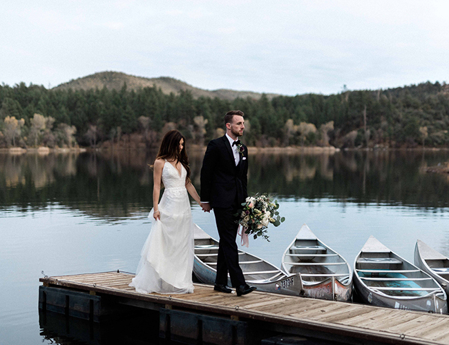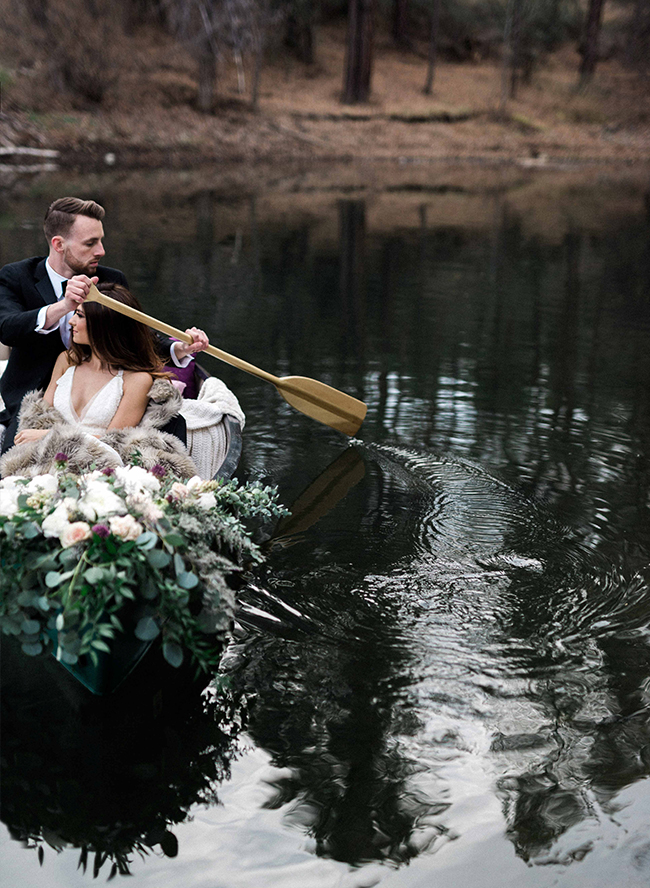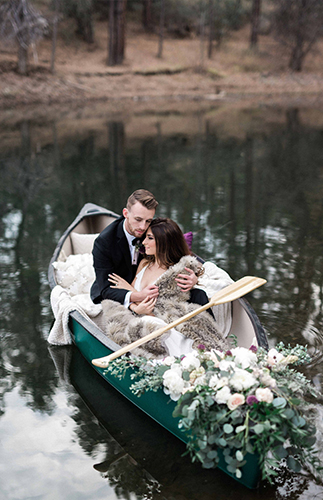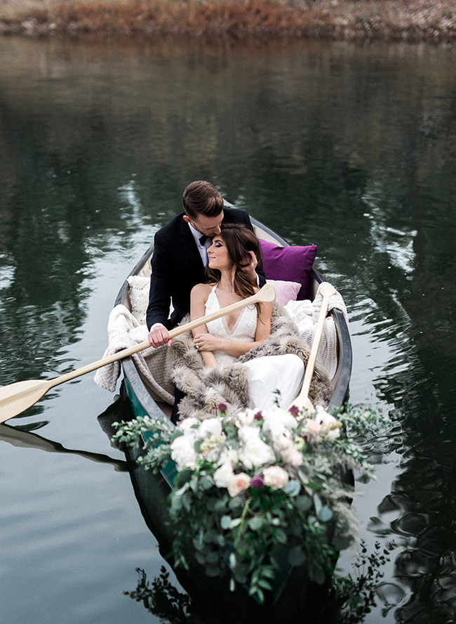Talk about romantic! It was just these two (and a talented team of vendors) in the woods and on a canoe in this beautiful winter lakeside elopement! We love the rustic, slightly mysterious setting. Above all, it provided a stunning backdrop and total seclusion. We’re pretty fond of the deep purple hues too.. anyone else?! Samantha Sanchez of Saje Photography describes her inspiration and how the team accomplished it to perfection below.