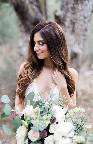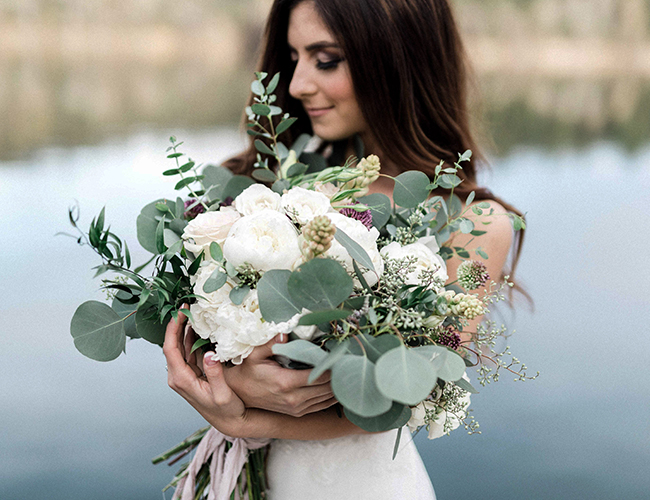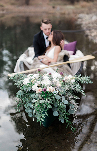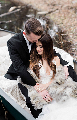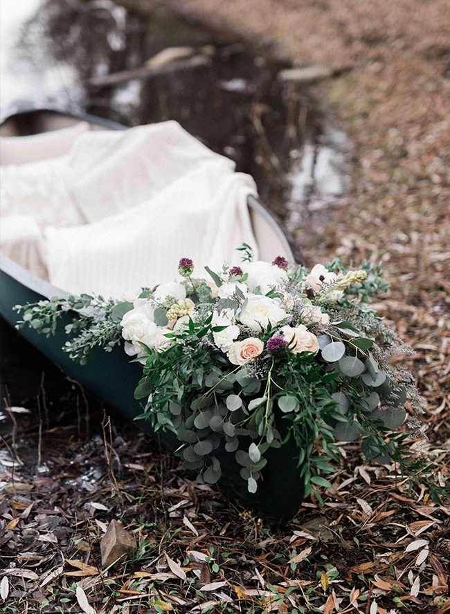 The canoe, draped inspired florals of peonies, eucalyptus, soft blush roses, added a romantic touch to the images. The Petal Theory handcrafted the perfect mix of elegance and romance for the bride’s bouquet. With soft tones, an abundance of greenery and pops of plum, the color scheme enhanced the natural beauty of the winter woods.