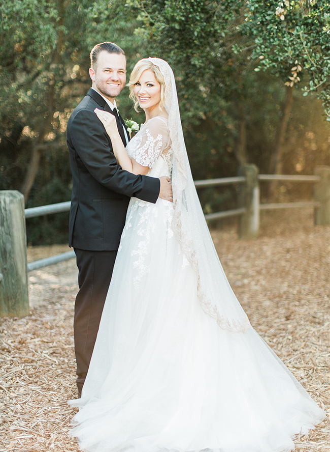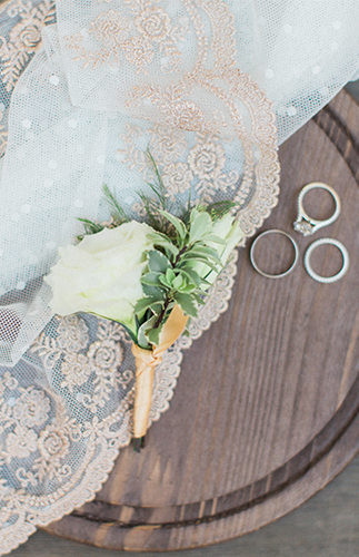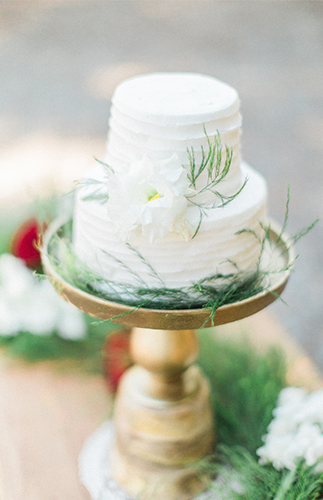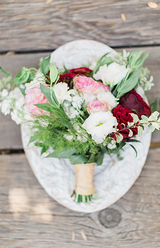 To lightly highlight this silver and gold theme, we chose traditional gold rimmed china paired with burning candles and lush, green florals. Our bride wore a stunning tulle dress with an elegant gold trim to touch on that holiday feel. We wanted our groom to look as traditional as possible with a clean black tuxedo. Together they are the epitome of elegance and charm. The loose, colorful bouquet was just what the shoot needed to tie everything together.