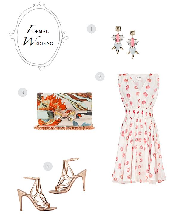 1. Topshop Spike Drop Earrings / 2. Reiss Lunata Poppy Printed Fit and Flare / 3. Ted Baker Paisley Bow Clutch Bag / 4. Reiss Melissa Lattice Curved Detail Sandal