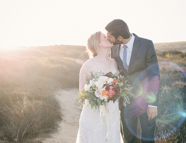 Who says you have to elope in Las Vegas or at the courthouse? This beach elopement on our wedding blog happened at sunrise and had a whole lot more going for it than an Elvis officiant and a little white dress. We’re talking about a beautiful big bouquet, a breakfast spread, and a getaway car adorned with a “Just Eloped” banner. We love this romantic and intimate wedding all about the bride and groom, and love how John Newsome captured it! Here’s what the creative team behind the beautiful morning had to say…