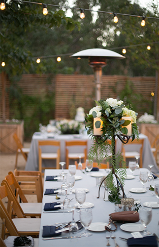 As an interior and event designer I was simply over-joyed to begin the process of designing/planning our wedding! Vince and I love “stormy” colors and natural textures and found coastal style as strong inspiration. Once we established our venue we began to see everything fall into place. We decided a “casual elegance” style would compliment the rustic “cafe” vibe of our outdoor setting. I loved the wrought iron candelabras, and dark wood floral boxes dripping in magnolia leaves and lush greenery created by our florist. A popcorn cart with signature toppings and spices greeted guests at the top of cocktail hour which was a big hit! Guests signed a canvas art piece created by my sister as they transitioned into the bistro light lined reception. The beautifully cloudy skies accented our color palette and Temecula’s signature evening winds made for amazing action shots captured by the gifted Kylie Chevalier photography.