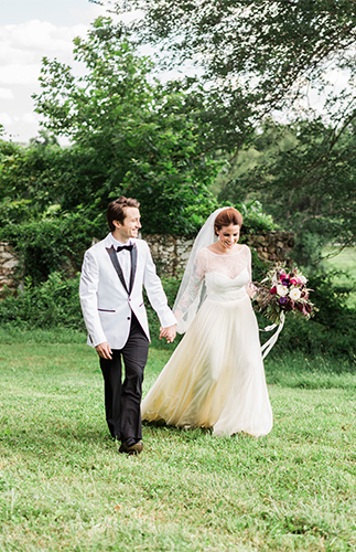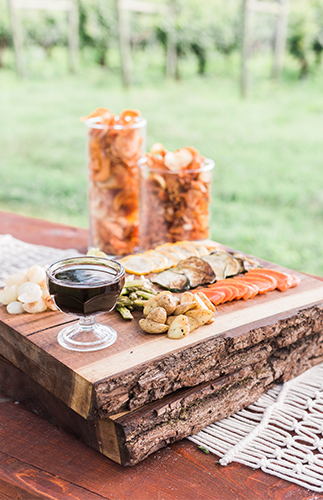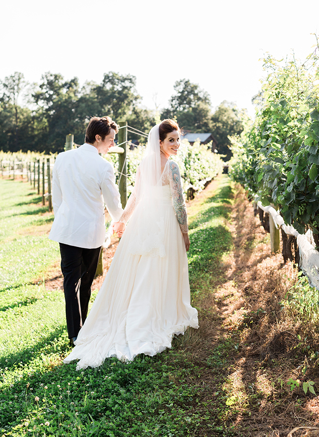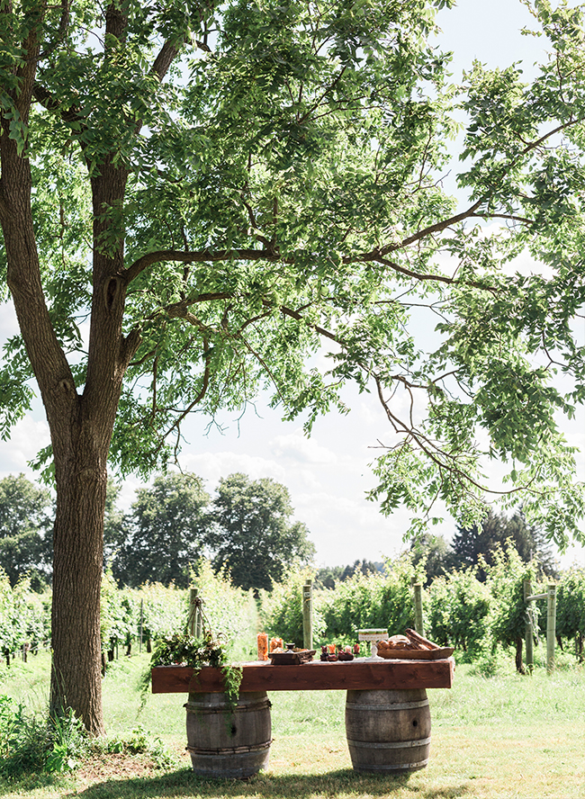 We imagined this wedding to be an intimate one, with the couple surrounded only by their closest family and friends, spending the evening eating delicious food and sharing wine and stories at a communal table. The vineyard allowed for taking advantage of the acres of gorgeous fields for portraits with details set in the rows of grapes themselves. The moments we chose to create are very much achievable by any bride and groom choosing a vineyard backdrop for their day.