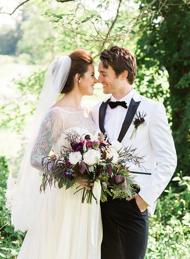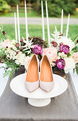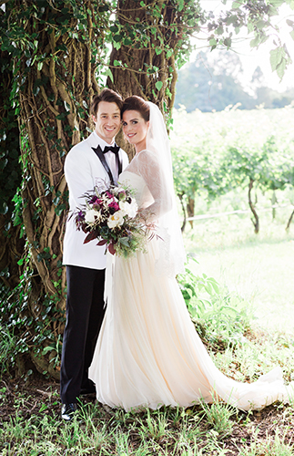 We’ve got a gorgeous vineyard wedding for you today on our wedding blog! Filled with pops of plum softened by pretty peach. Apart from the beautiful setting, it is filled with gorgeous stationery, florals, and a delectable spread of appetizers – finished off by a crepe cake! Bottle Pop Party Co. planned this inspiration shoot complete with a cocktail reception, sweetheart table, and vintage car getaway. We love the romantic shots by Hudson Nichols Photography of the bride & groom strolling through the rows of vines and along the tall trees.