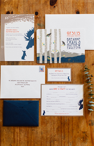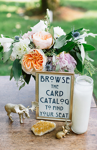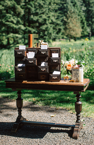 From the photographer, It was a hundred degrees that day, but under the soft shade of the trees in the Columbia River Gorge, Breanne and Matt hardly noticed at all. They were married on the grassy shore of Bridal Veil Lake, and relaxed afterwards at their whimsical reception, decorated beautifully with pink and coral pastel flowers, navy and gold accents, sparkling geodes and a playful theme based on the love between a bunny and a moose (she loves bunnies, and he is tall like a moose). They also incorporated their love of literature into the day by naming tables after their favorite books and using a vintage card catalog for their seating chart. The decor perfectly encapsulated their playful but stylish personalties and the night was beautifully relaxed, fun, and gorgeous.”From the bride:Matt is a a Unix and Cloud Systems Engineer and I’m a Science teacher. We met in school during an early morning rowing practice when Matt nearly squashed me during a set of co-ed plyometric exercises. With Matt graduating and moving to southern California, I moved to Oregon to pursue a love of the outdoors and sciences at Oregon State University. Fast forward ten years and we were living in southern California and recently engaged (it happened in the country-side of France!) and it was time to start planning. Matt and I knew that we wanted our wedding day to remain true to ourselves, with the perfect blend of traditional and fun. We knew the focus of our budget would be our venue and photographer. With the great majority of the guests traveling from out of state, including us, open invitation events were scheduled the days leading up to the ceremony. This enabled us to meet with our friends and family for a longer period of time than during a reception line and guests appreciated getting to know each other prior to the wedding so they were sitting with friends rather than strangers. Because the wedding was a destination, renting the majority of the decorations was a life-saver!